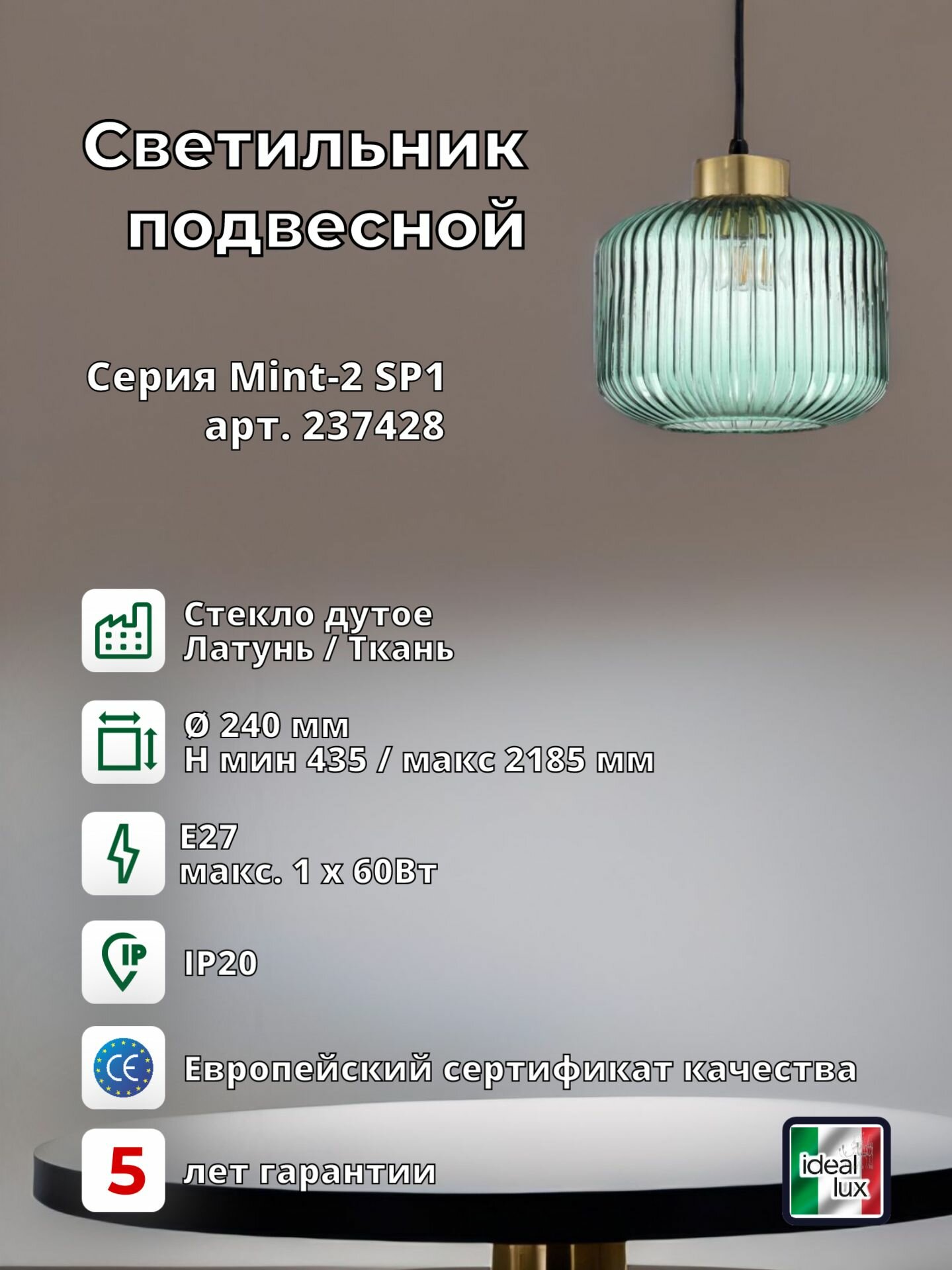 Светильник подвесной ideal lux Mint-1 SP1 макс.1х60Вт IP20 Е27 230В Зеленый/Латунь Стекло/Металл Без лампы 248554.