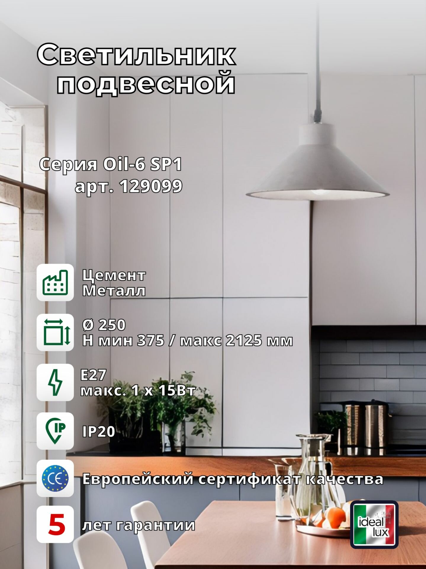 Светильник подвесной ideal lux Oil-5 SP1 макс.1x15Вт IP20 Е27 230В Серый/Черный Цемент/Металл Без лампы 129082.