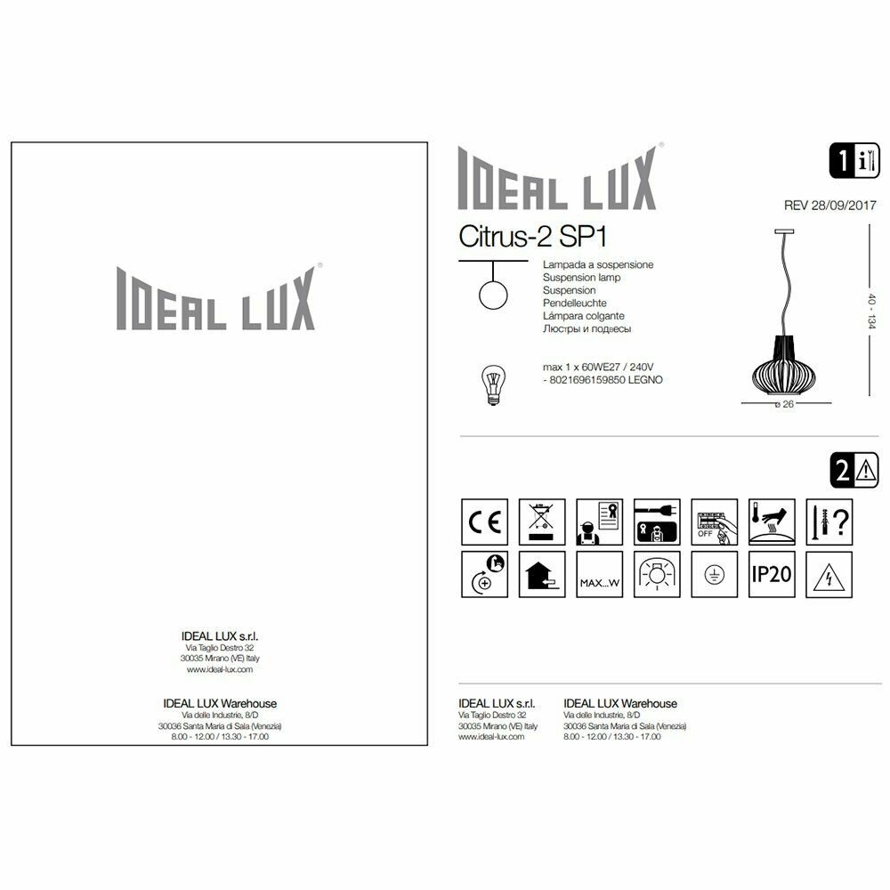Купить Светильник подвесной ideal lux Citrus-2 sp1 макс.1x60Вт e27 230В IP20 Натуральный/Черный Фанера/Металл Без лампы 159850.