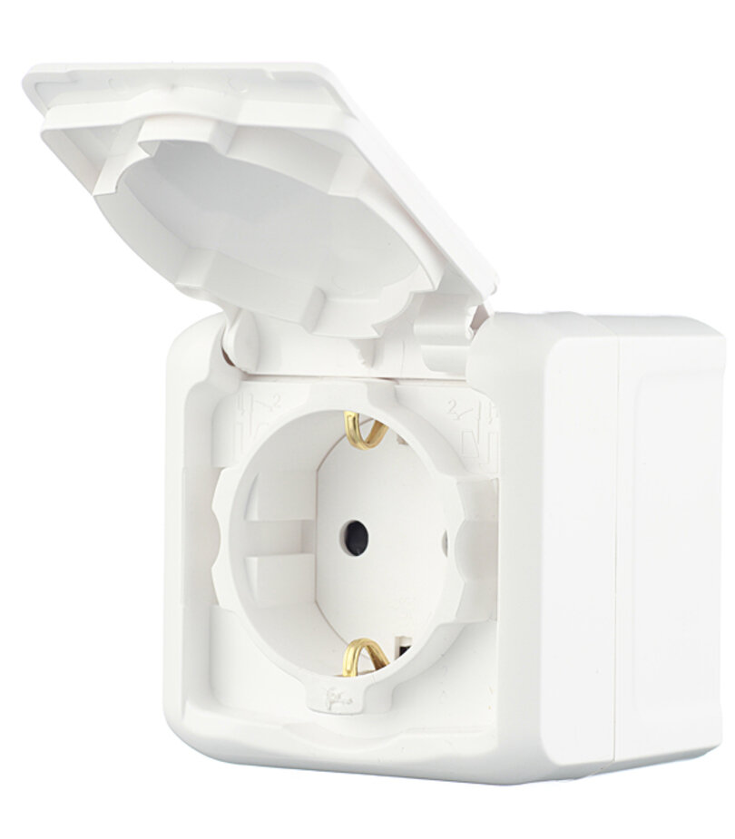 Розетка Legrand QUTEO, открытый монтаж, с заземлением, с крышкой, со шторками, белый, IP44, 782321