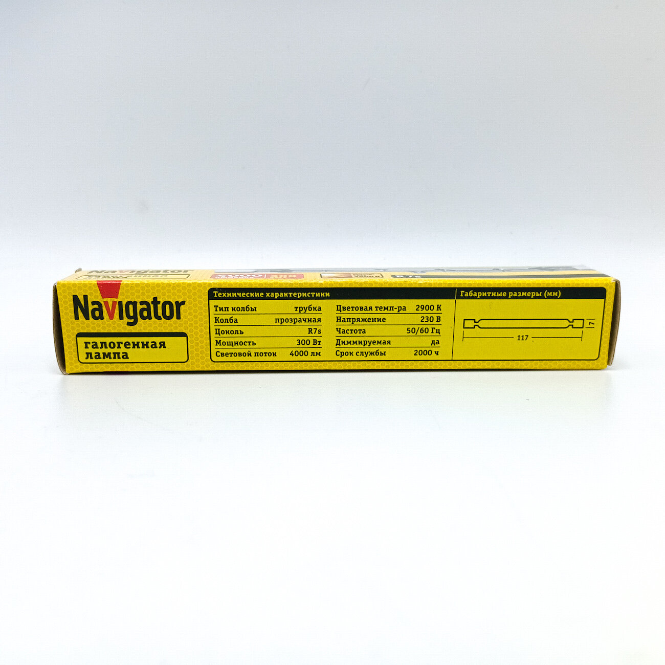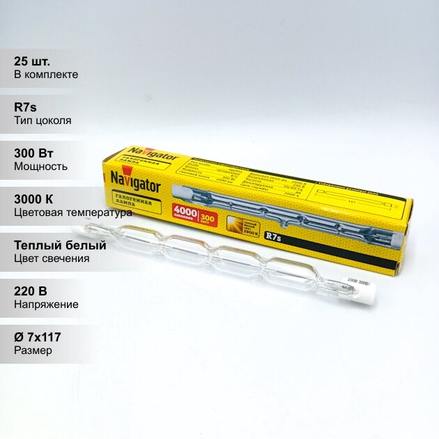 Купить (25 шт.) Галогенная лампочка Navigator J117, мощность 300Вт, напряжение питания 220В, цоколь R7s, цветовая температура 2900 К, теплый белый свет, размер 117x7мм