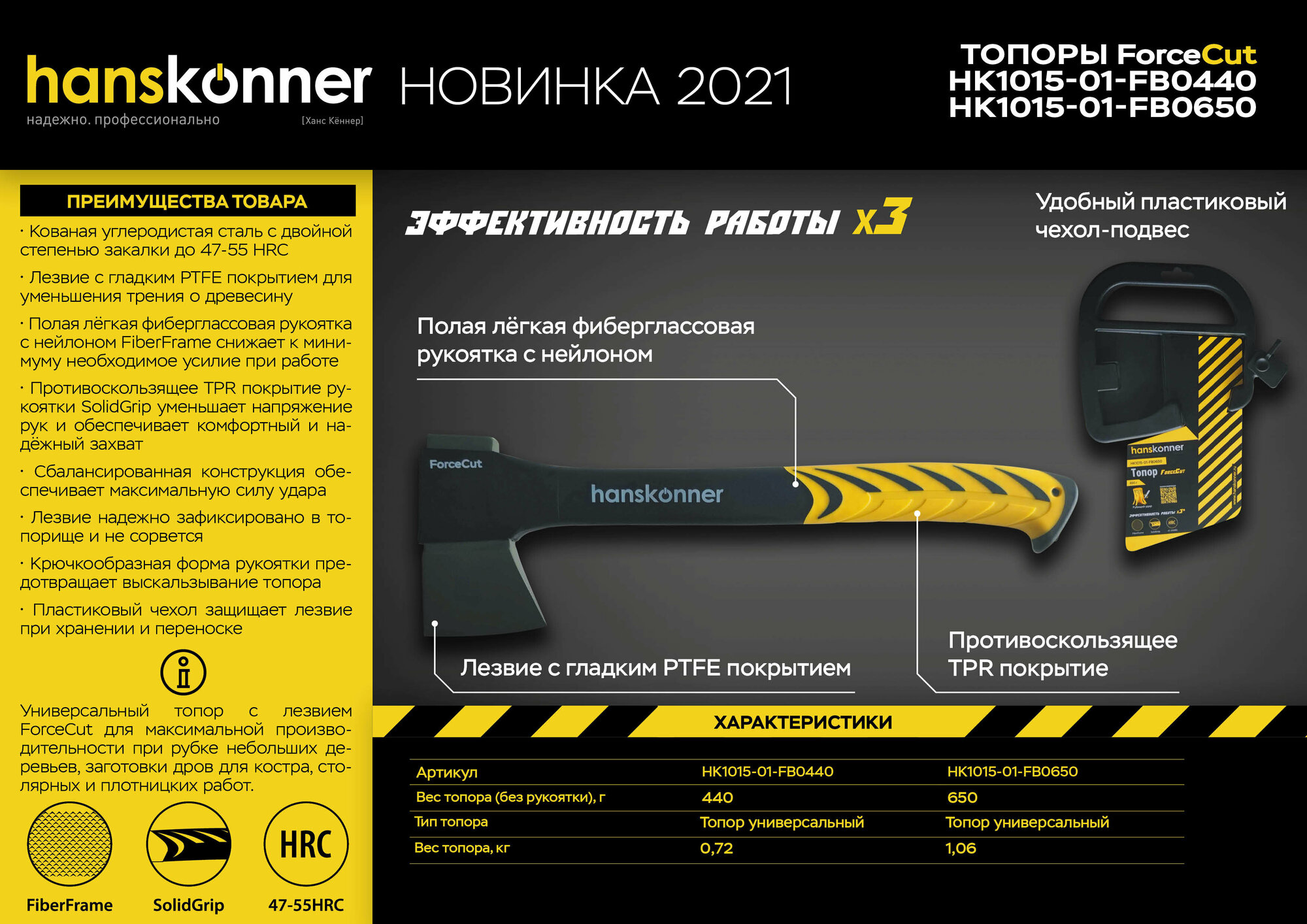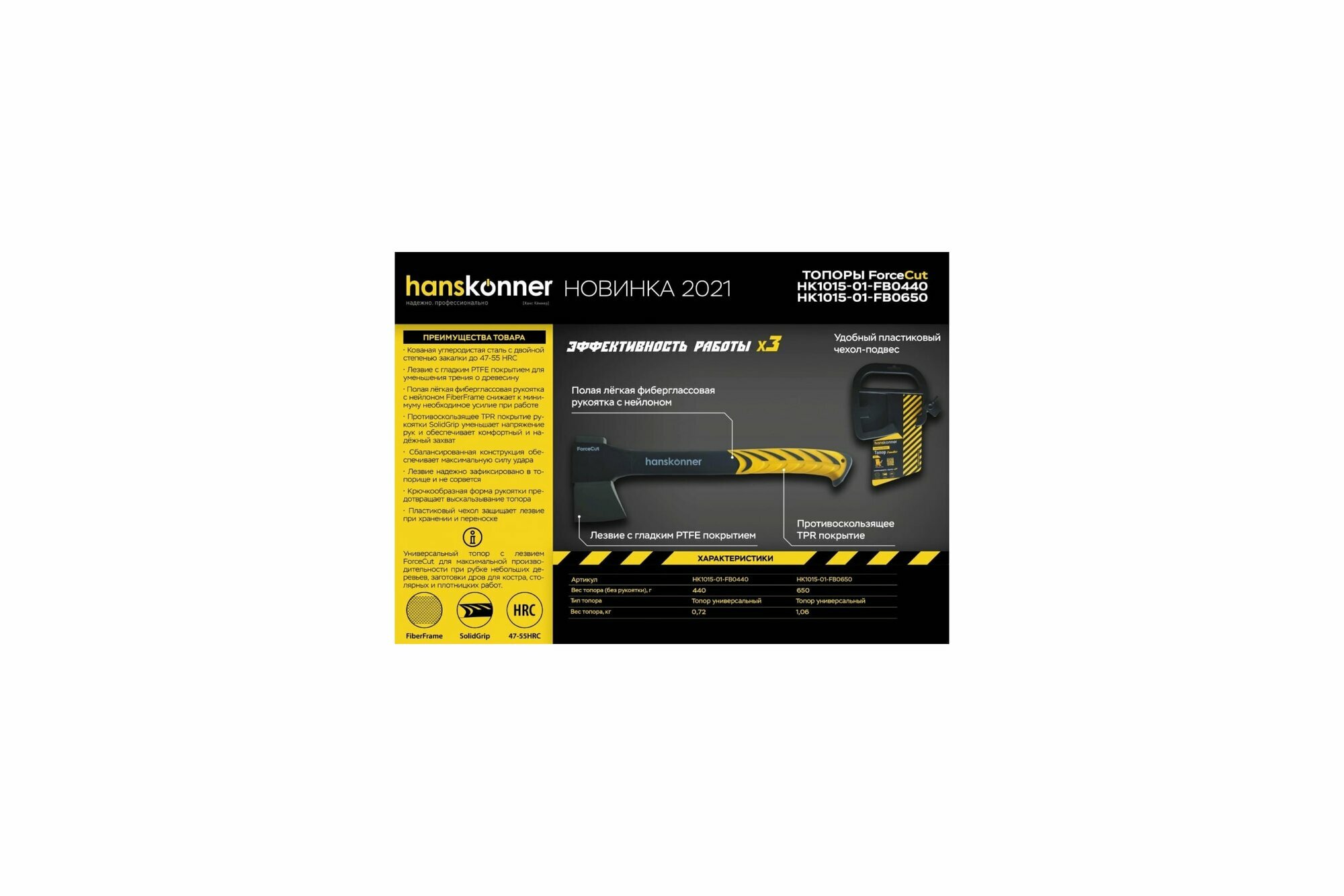 Топор HANSKONNER HK1015-02-FB0650 650г, фибергл. рукоятка