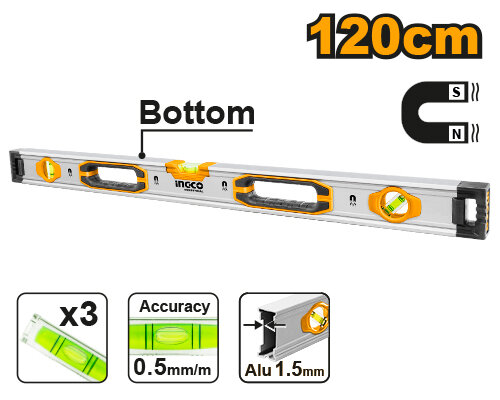 Уровень строительный пузырьковый с мощными магнитами Ingco HSL38120M,120 см, 3 уровня