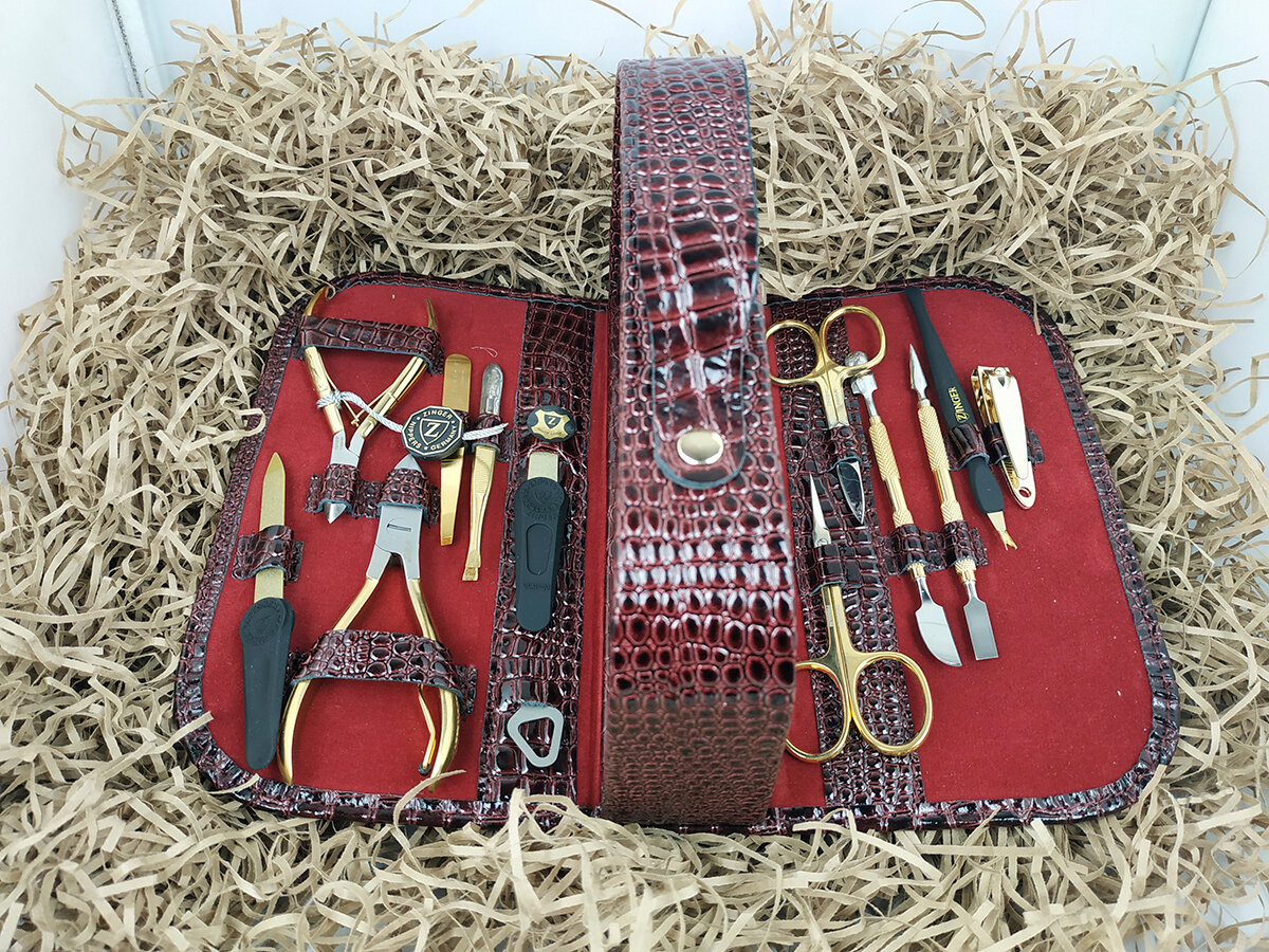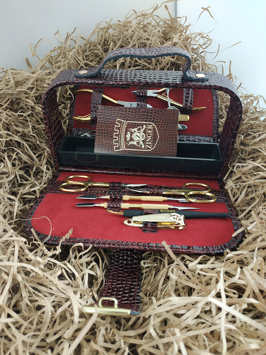 Маникюрный набор Zinger MS-1101-BG, позолоченный/темно-красный крокодил, 12 предметов