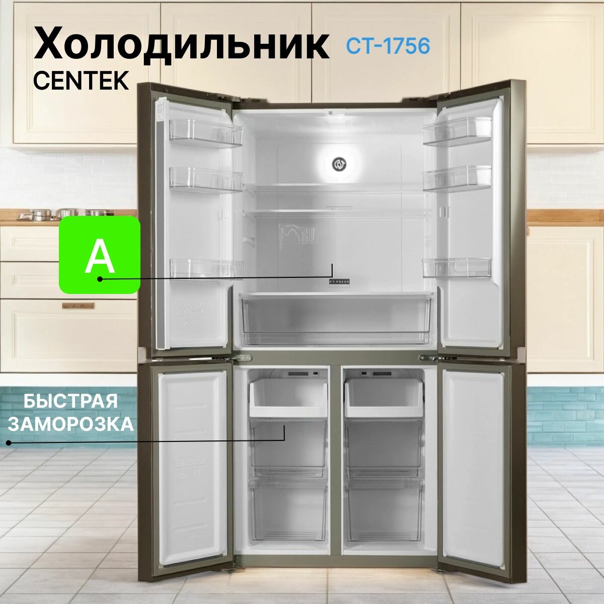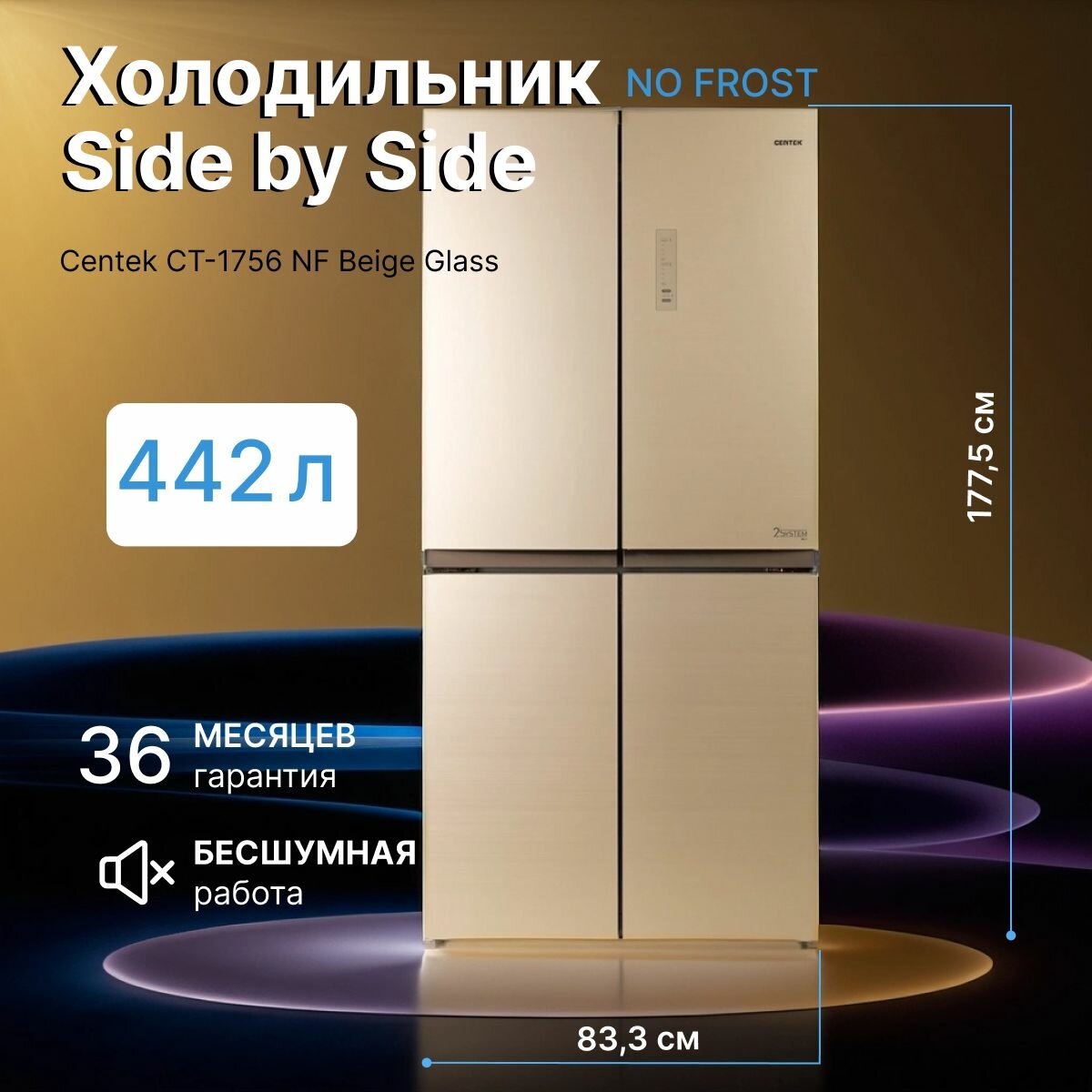 Холодильник трехкамерный CENTEK CT-1756 NF No Frost, Side by Side, инверторный бежевый