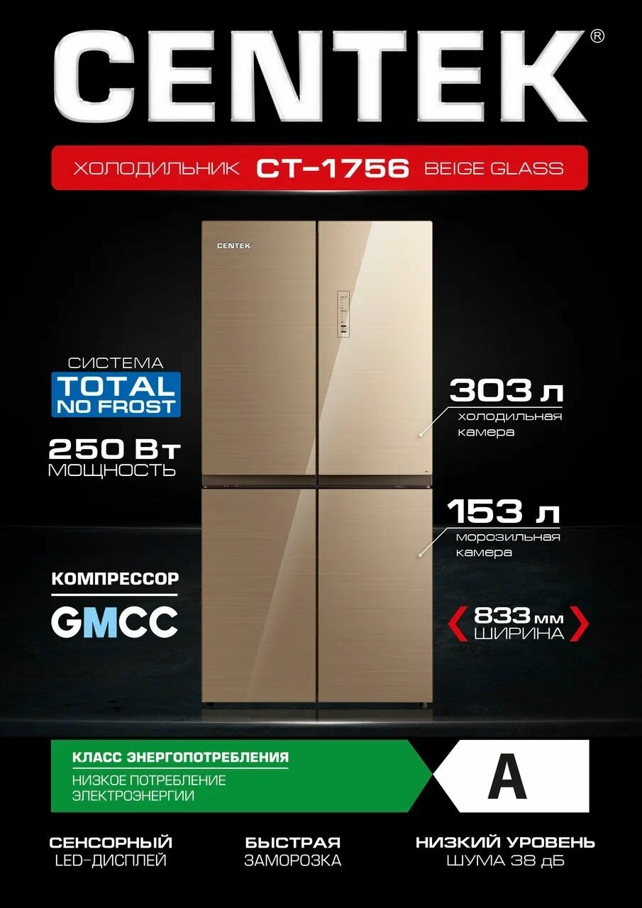 Купить Холодильник четырехдверный Centek CT-1756 Beige Glass Total NF, Side-by-Side, 442л (153л/289л), cтекло, с распашными дверями