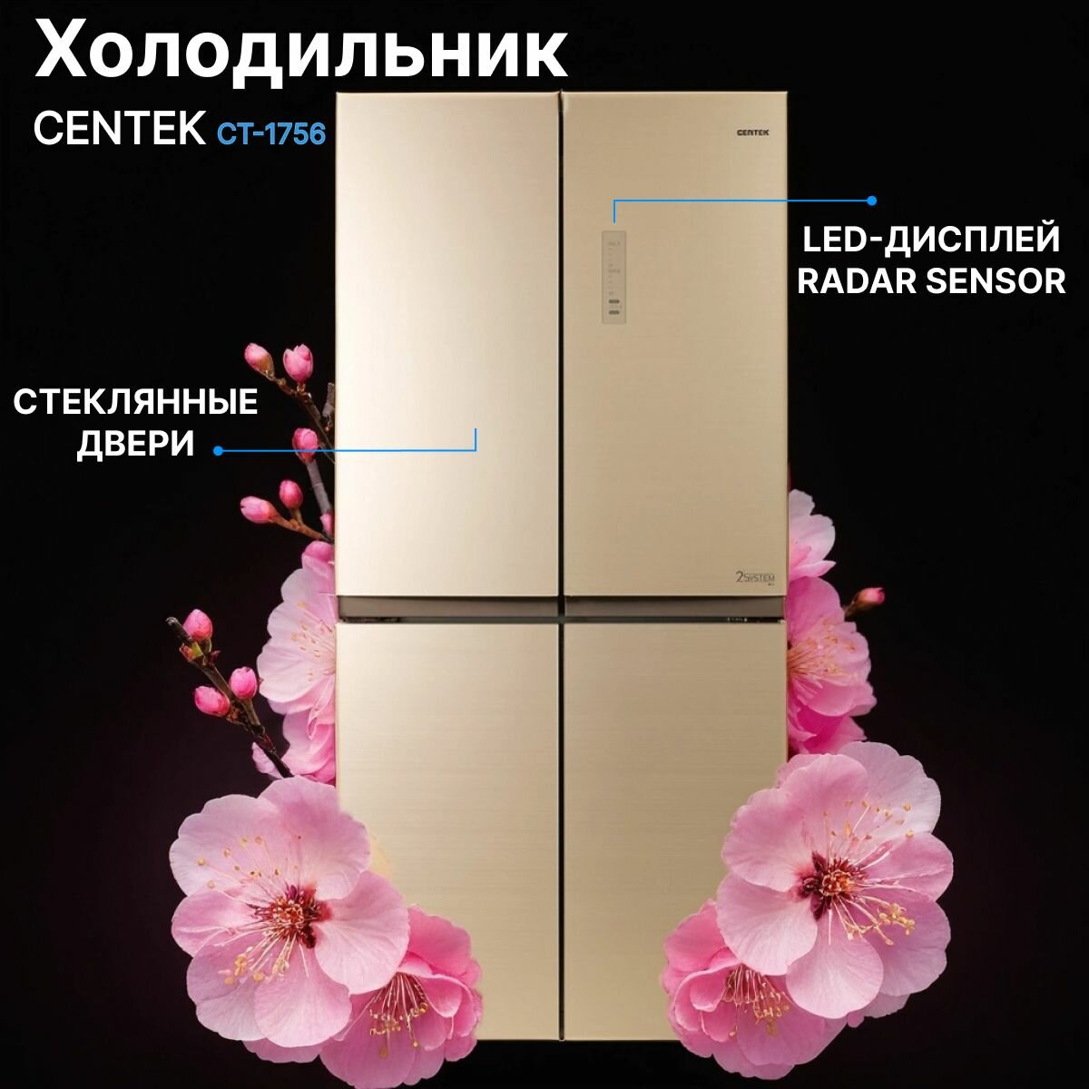 Холодильник четырехдверный CENTEK CT-1756 Beige Glass Total NF: 442л (289л/153л), cтекло, с распашными дверями, Side-by-Side