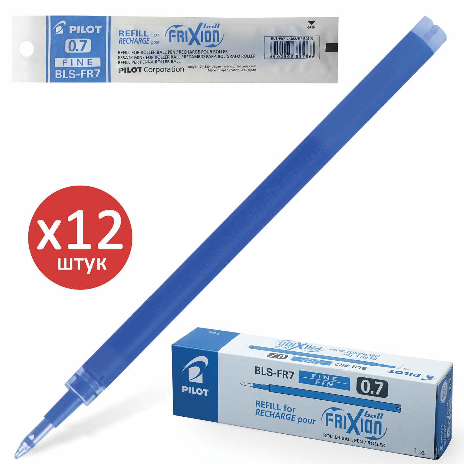 Стержень для гелевой ручки PILOT BLS-FR7, стираемые чернила, 0.35 мм, 111 мм (12 шт.) синий