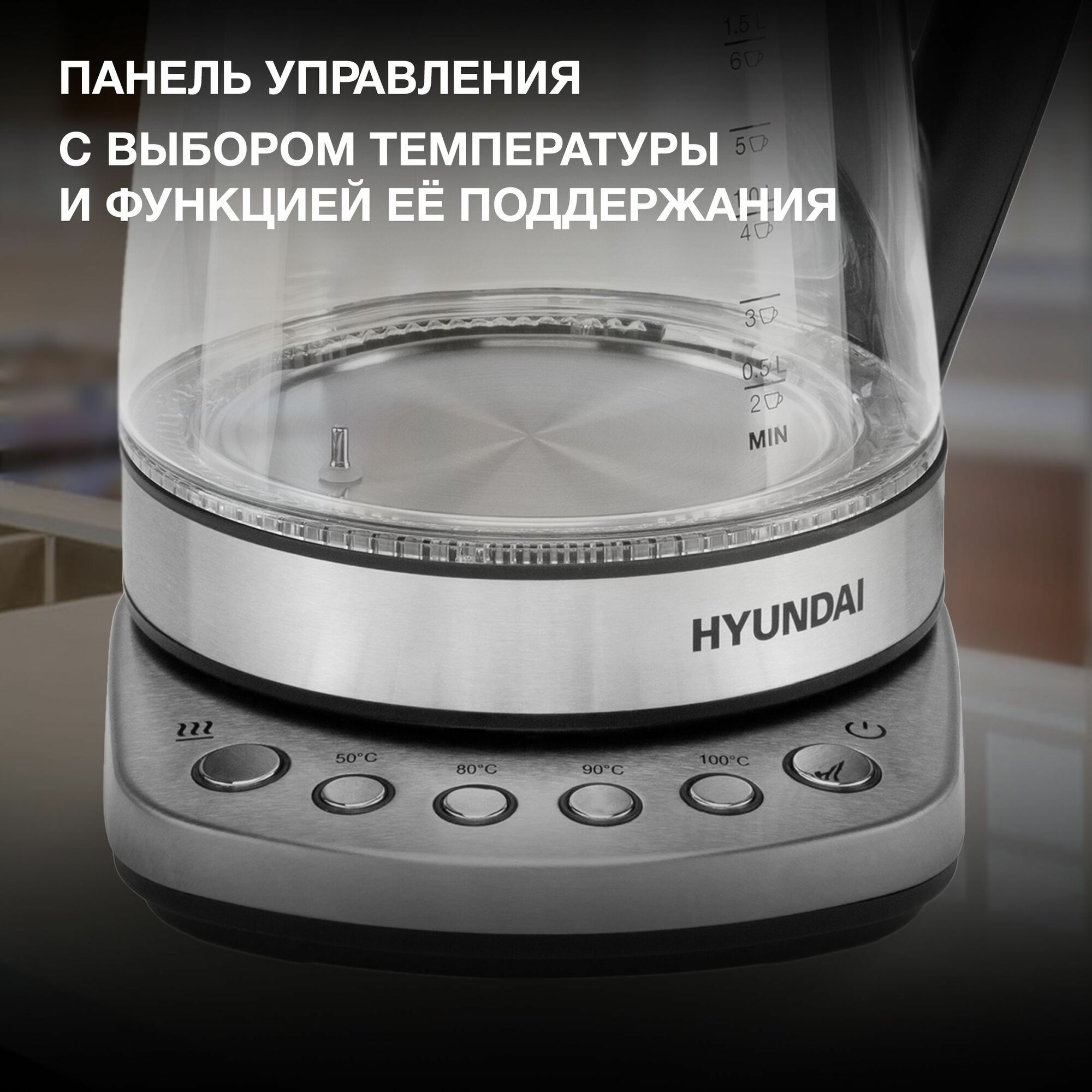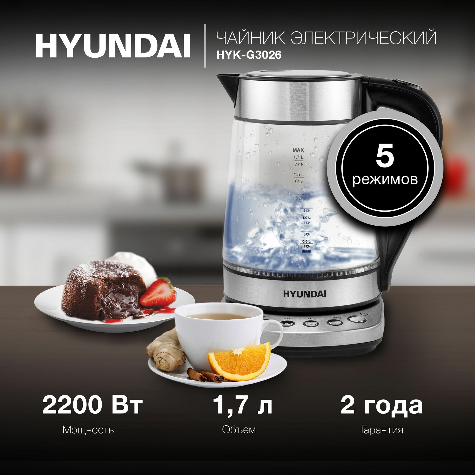 Чайник электрический Hyundai HYK-G3026 серебристый/черный, объём 1.7л, мощность 2200Вт, материал корпуса: стекло интересное: