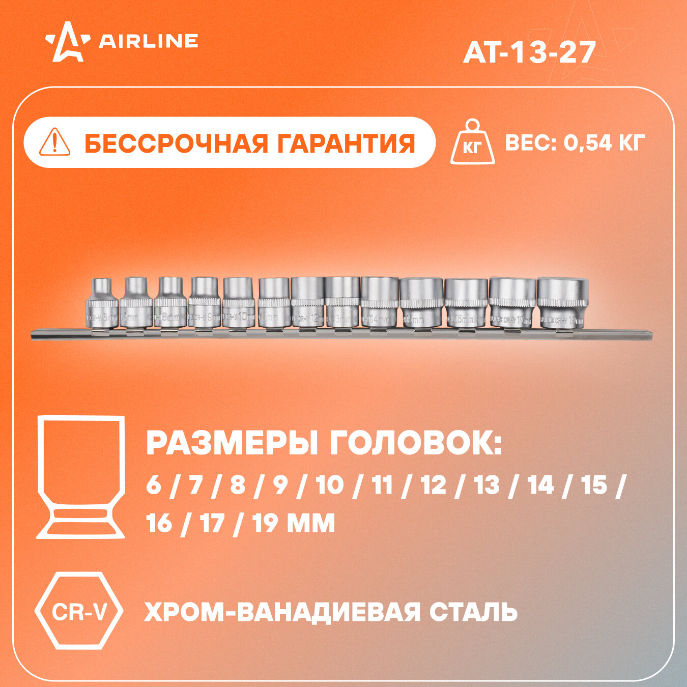 AIRLINE AT-13-27 Набор головок торцевых 3/8 DR шестигранных 13пр. (6-17,19мм) мет.подвес