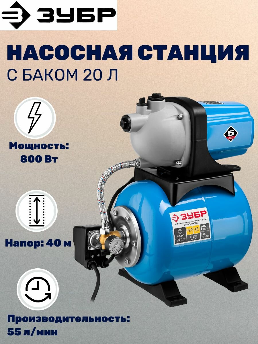 ЗУБР Станция насосная ЗУБР "Мастер" М3 автоматическая, 800 Вт, пропускная способность 55 л/мин, напор 40 м, бак 20 л