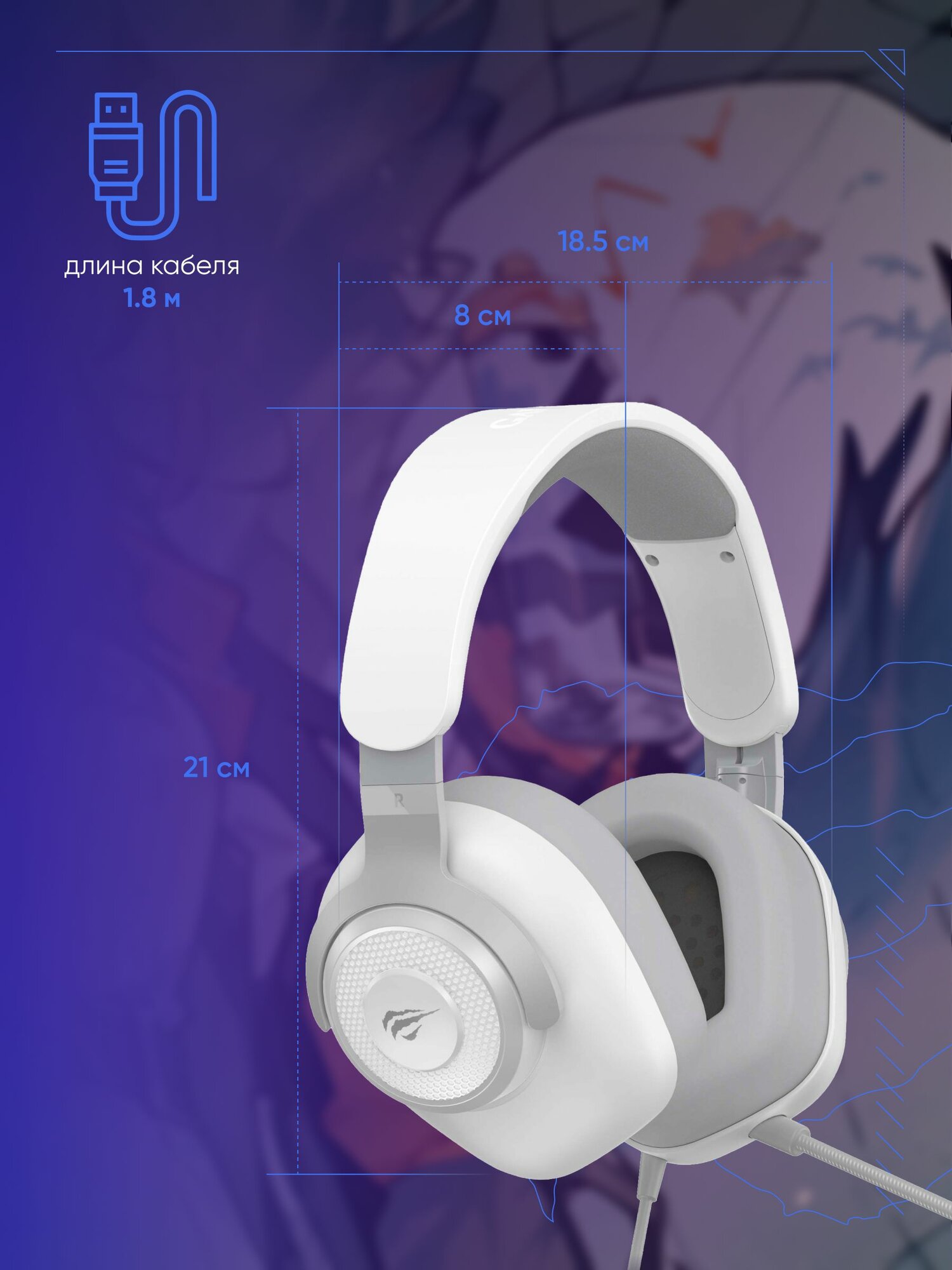 Наушники игровые, геймерские, проводные с микрофоном Havit H2008d белый/фиолетовый 3.5 jack