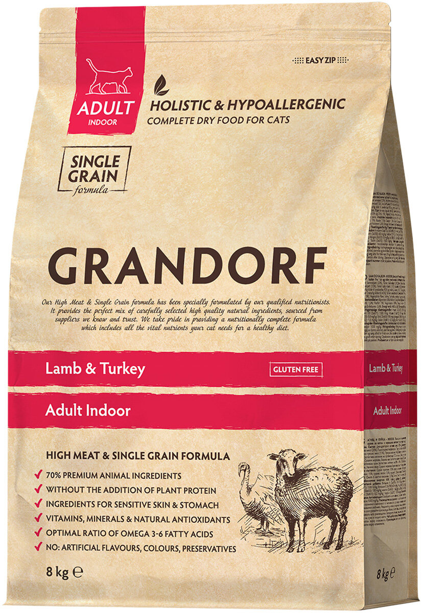 GRANDORF SINGLE GRAIN CAT ADULT INDOOR LAMB & TURKEY низкозерновой для взрослых кошек живущих дома с ягненком и индейкой (2 + 2 кг)