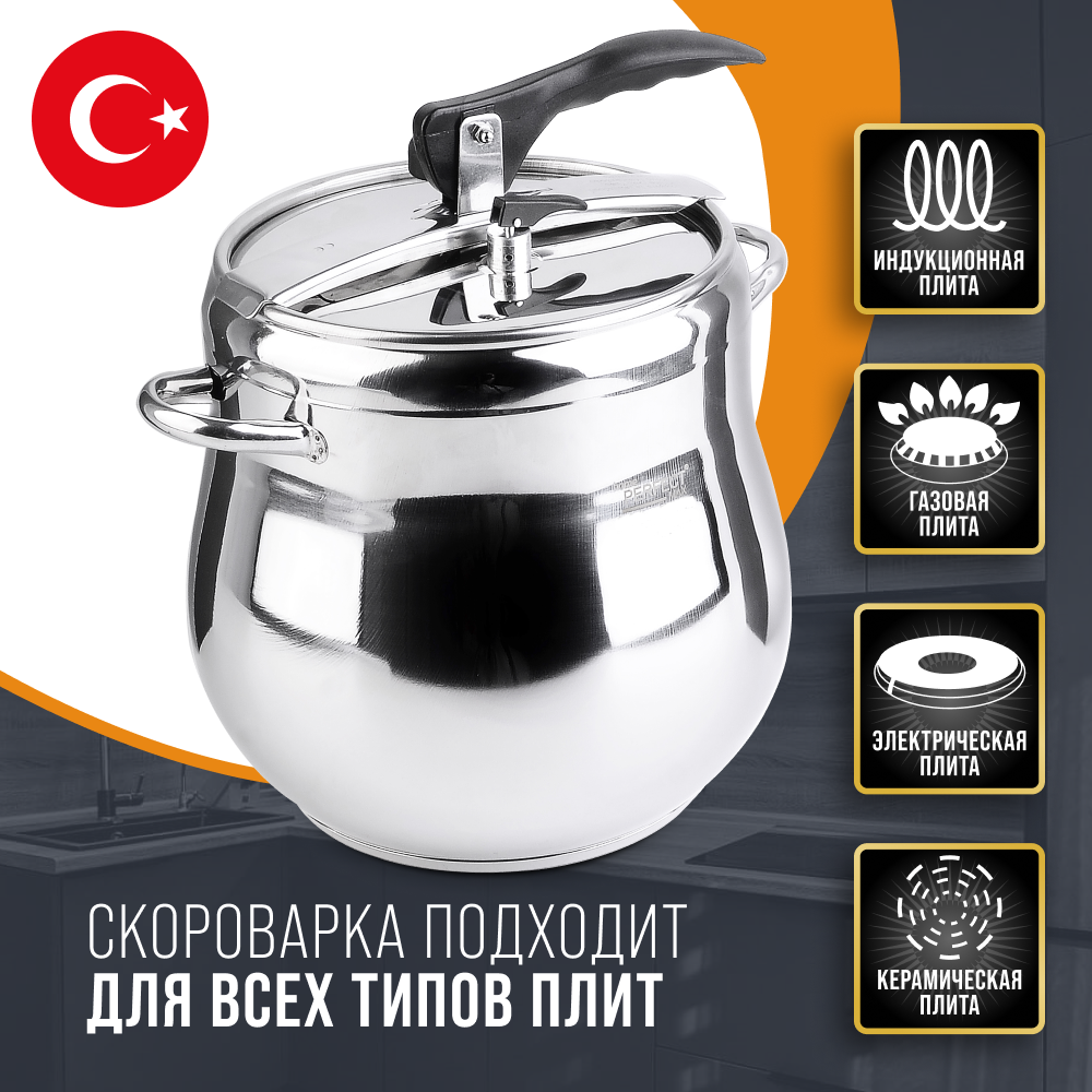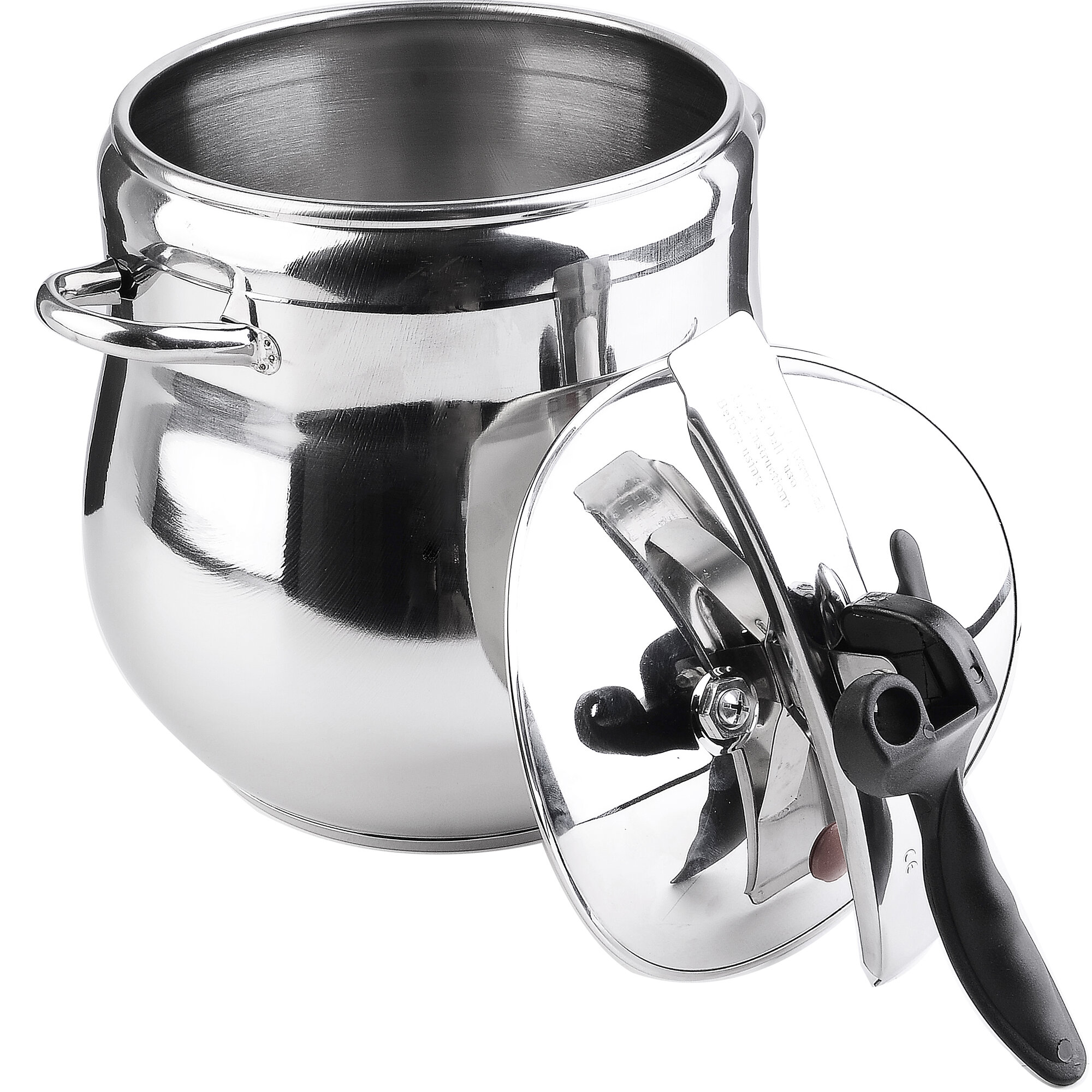 | Дополнительная информация | капсульное дно; оснащена клапаном контроля давления и клапаном избыточного давления; максмальное рабочее давление 55 кПа; ручки на заклепках; зеркальная полировка |