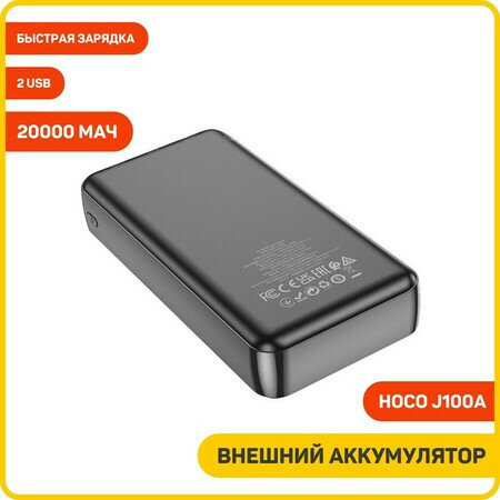 Универсальный Доп. Аккумулятор 20000mAh, J100A, HOCO, выход: 2 USB (5V/2A), черный