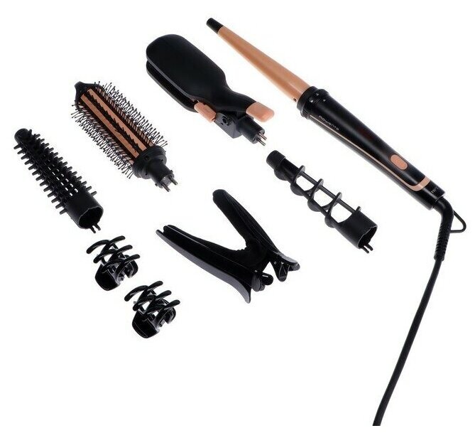 | Дополнительная информация | насадки в комплекте: щипцы для завивки; насадка для локонов; насадка для выпрямления; круглая щетка; конические щипцы |