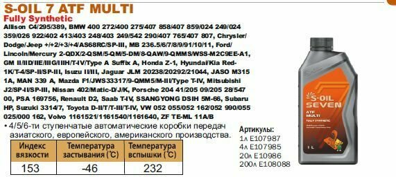 S-OIL E107985 S-OIL Масо трансмиссионное SEVEN ATF MULTI 4 интересное: