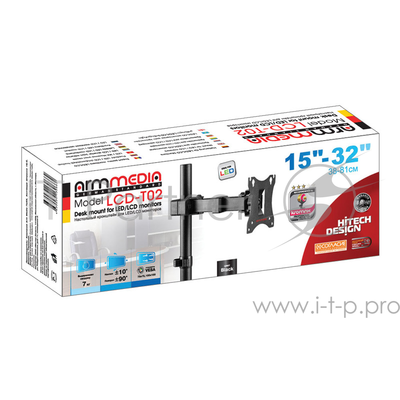 Кронштейн для мониторов Arm Media LCD-T02 black 15-32, max 7 кг, 5 ст свободы, наклон ±10°, поворот ±90°, высота штанги 358 мм, max VESA 100x100 мм