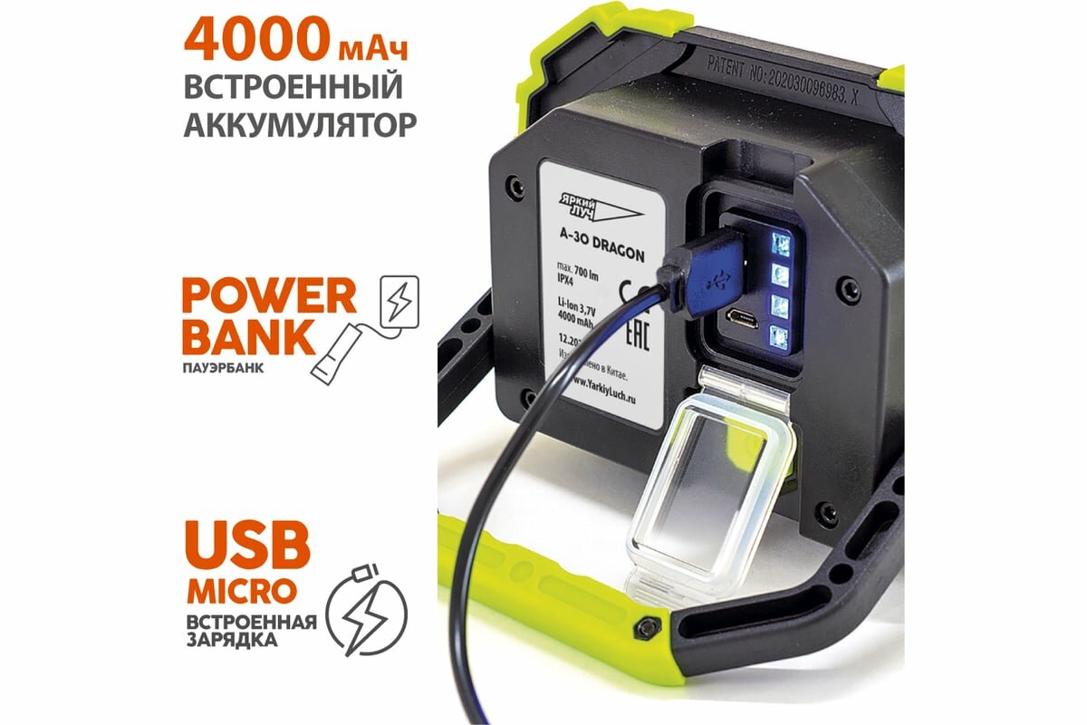 Прожектор аккум. Яркий ЛУЧ "dragon" A-30 COB-диод max700лм 3+3реж, Ip44, переносной, Li-ion 4000mAh интересное: