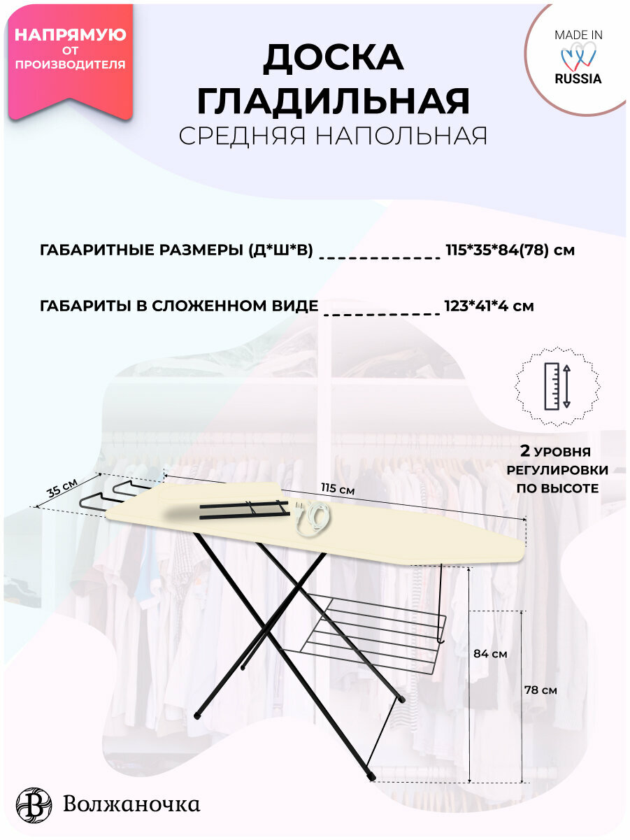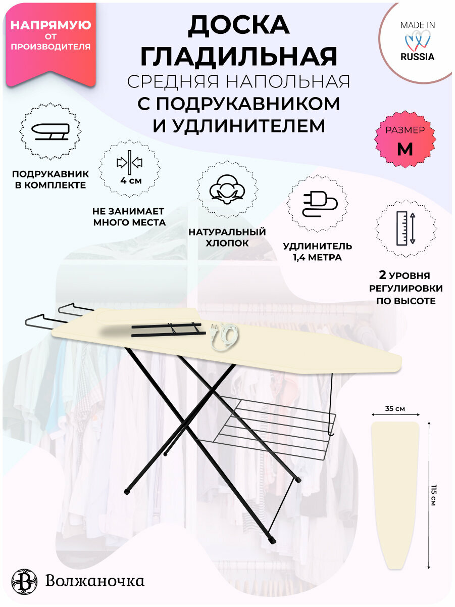 СохранитьВолжаночка Гладильная доска напольная с подрукавником, подставкой для утюга, полочкой для белья, розеткой и удлинителем, размер 115х35 см., цвет светло-бежевый интересное: