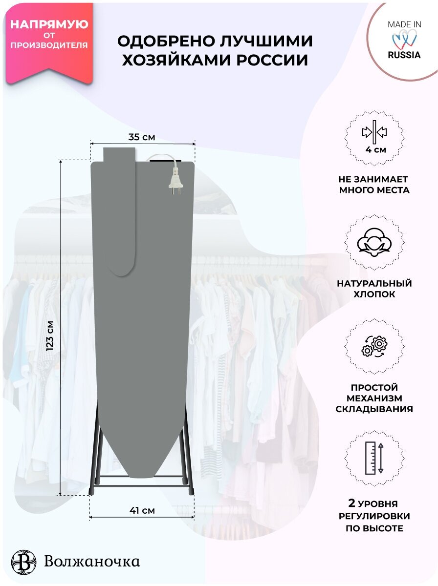 СохранитьВолжаночка Гладильная доска напольная с подрукавником, подставкой для утюга, полочкой для белья, розеткой и удлинителем, размер 115х35 см., цвет серый интересное: