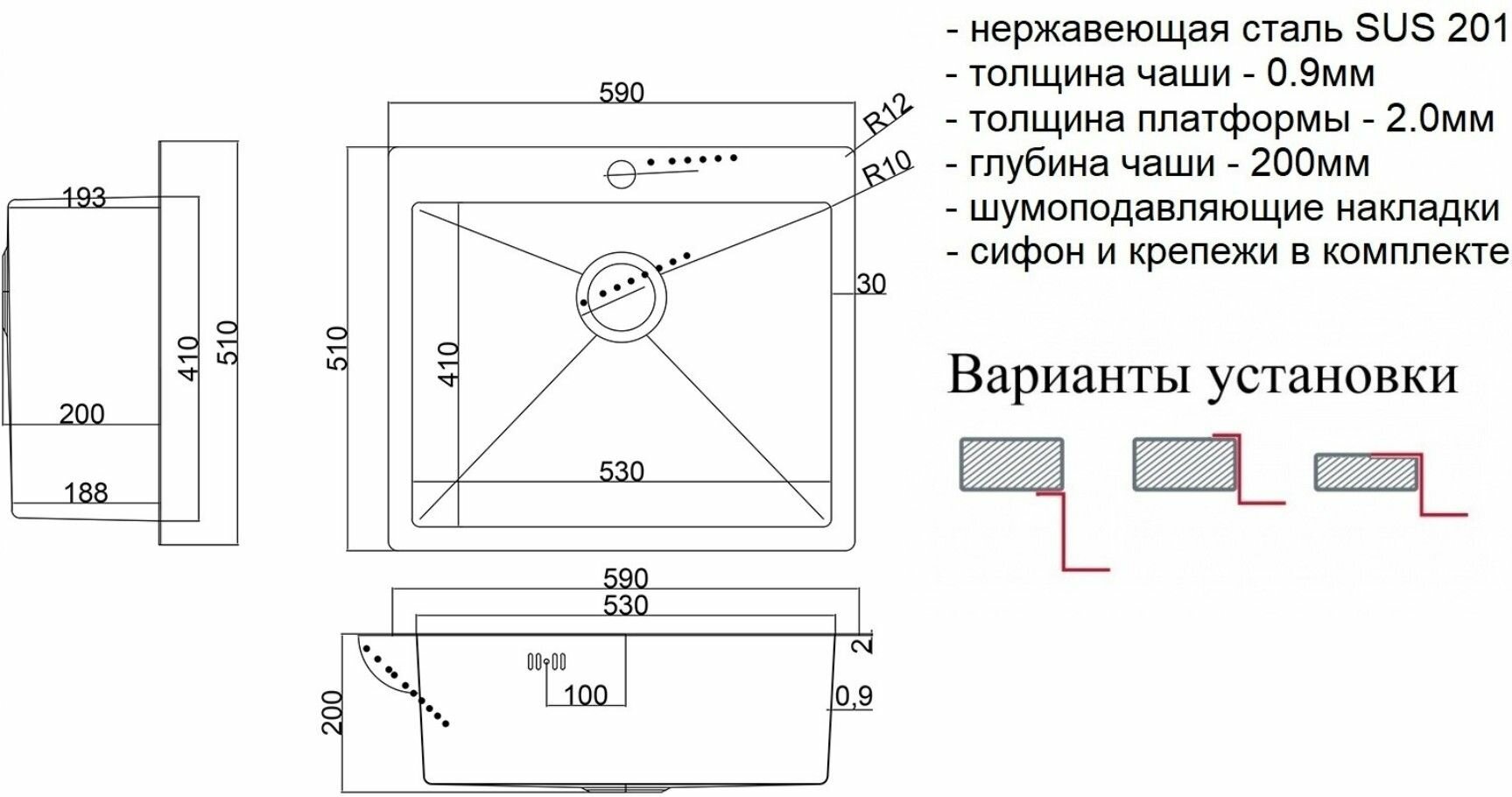 | Дополнительная информация | комплектация: мойка, сливная арматура с корзинчатым вентилем 3 1/2", сифон с отводом, комплект креплений |