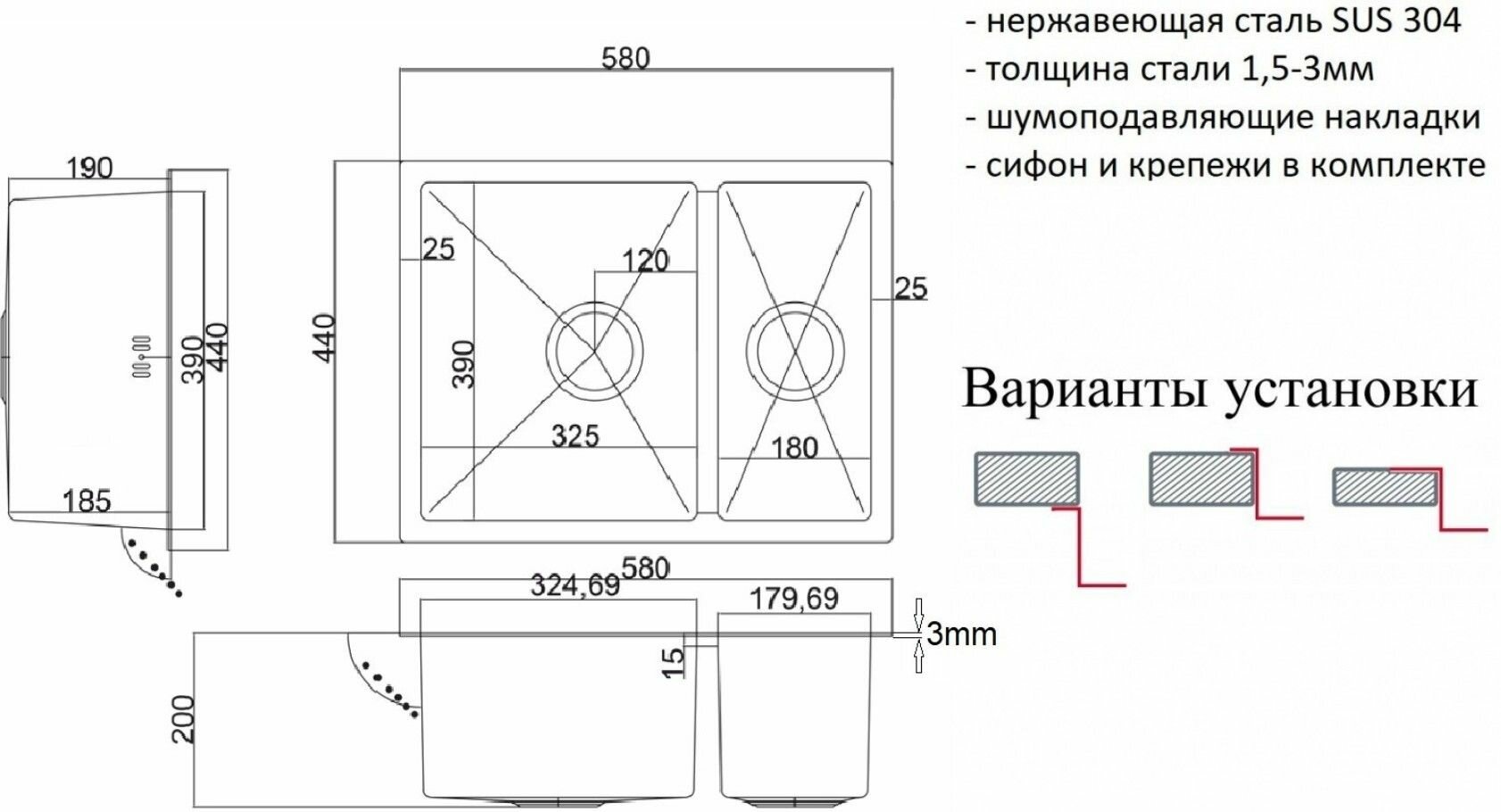 | Особенности | дополнительная чаша / корзинчатый вентиль / отверстие под смеситель / сливная арматура |