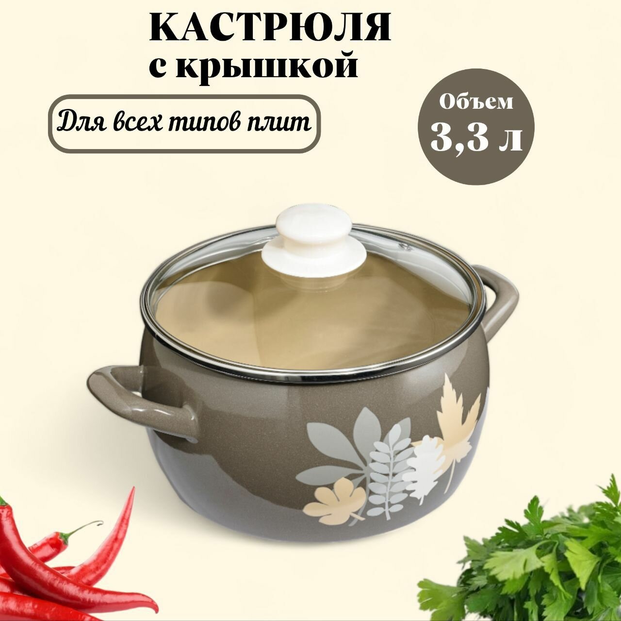Кастрюля глубокая эмалированная со стеклянной крышкой, 5,7 л, Осенняя соната