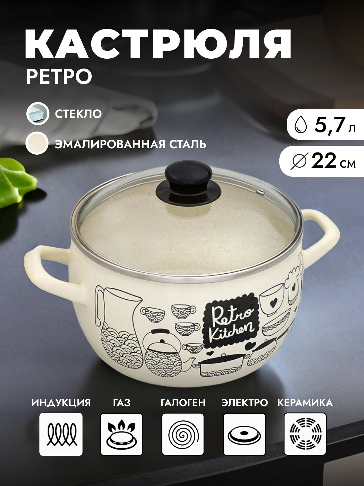Кастрюля глубокая эмалированная со стеклянной крышкой, 5,7 л, Ретро