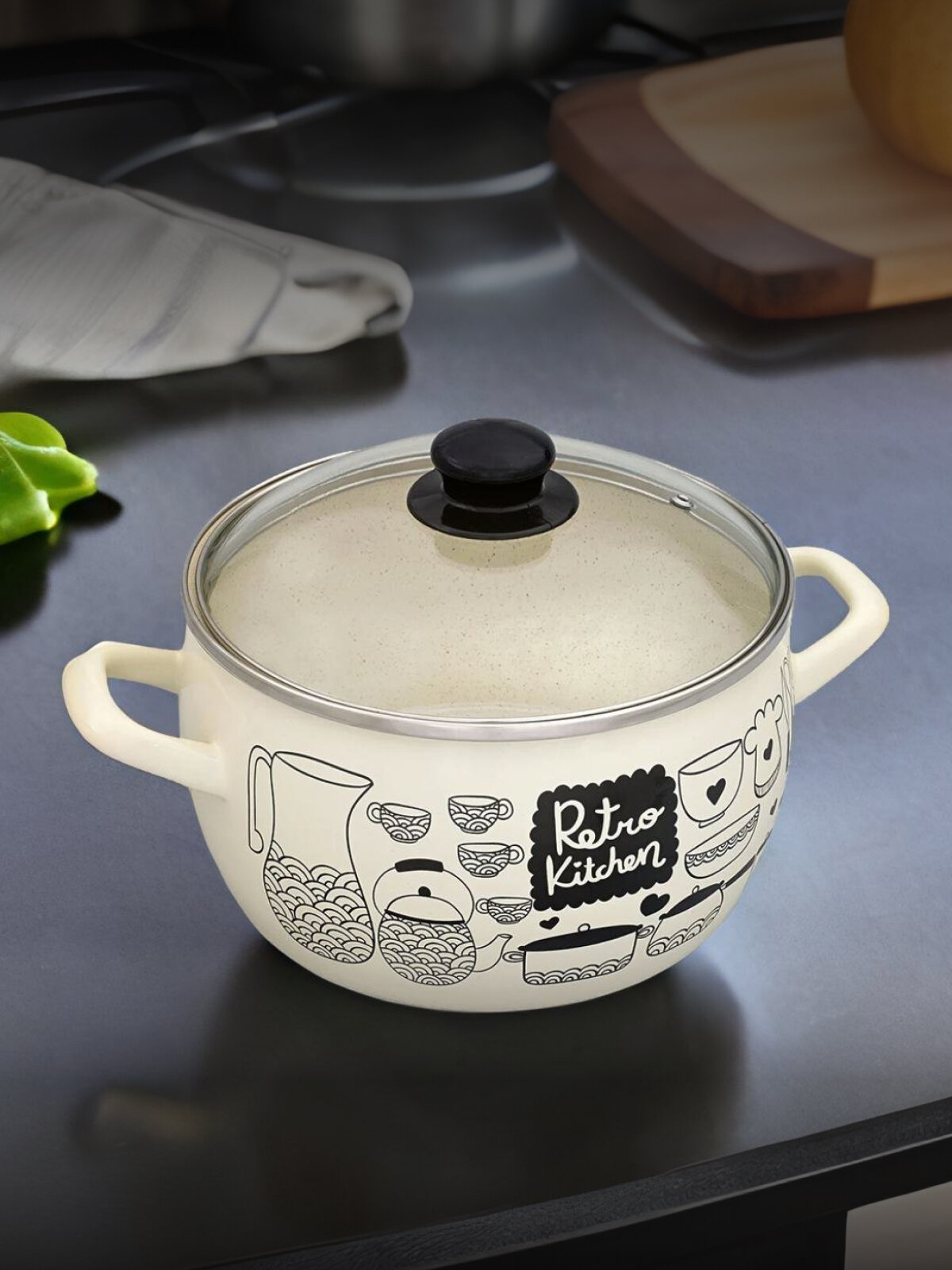 Кастрюля эмалированная из стали Metrot / Метрот Ретро, объемом 3.3л со стеклянной крышкой, для всех видов плит / посуда для кухни