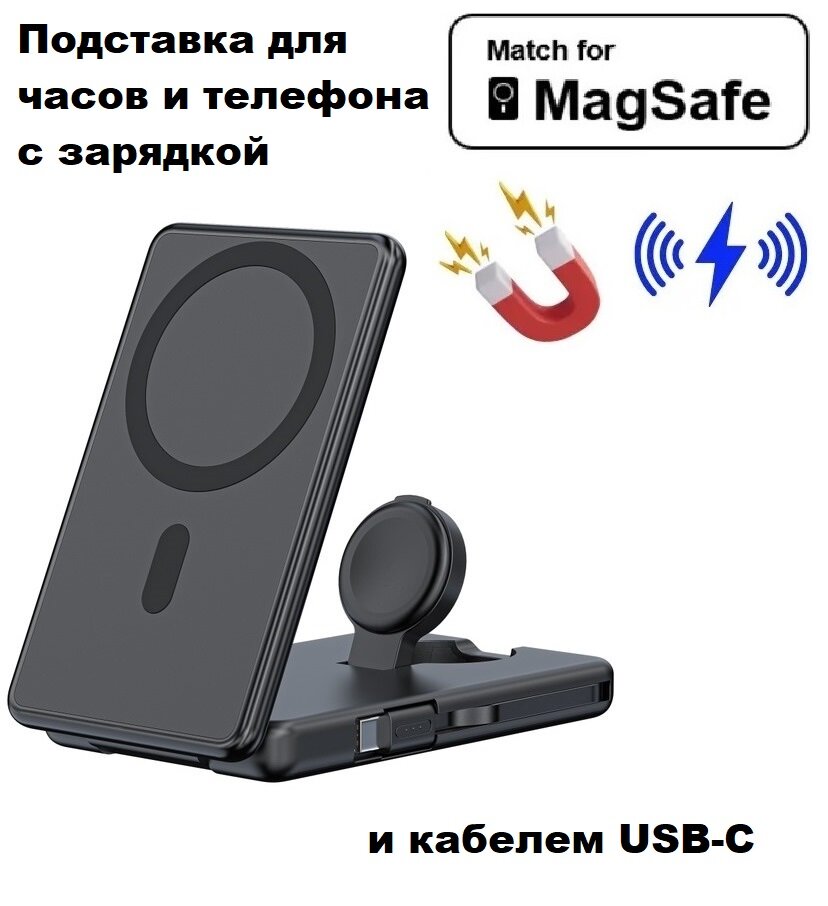 Быстрая беспроводная магнитная зарядка для айфона с функцией MagSafe / мощность 15W / со складной подставкой / черная