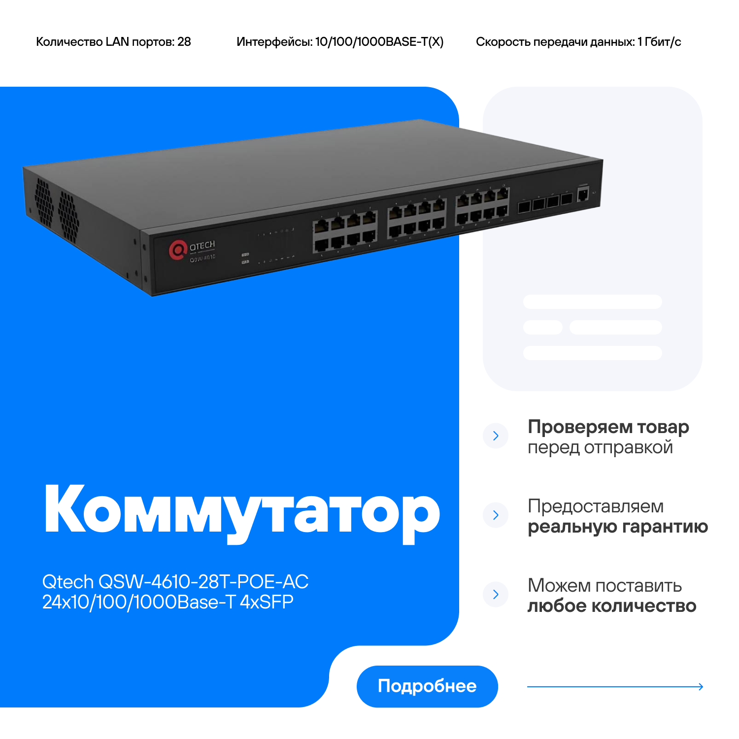 Ниже Вы можете прочитать отзывы на Коммутатор QTECH QSW-4610-28T-POE-AC управляемый L2+ 24 х 10/100/1000BASE-T PoE 4 х 100/1000BASE-X SFP, ознакомится с подробными характеристиками, посмотреть интересные обзоры и фотографии на Коммутатор QTECH QSW-4610-28T-POE-AC управляемый L2+ 24 х 10/100/1000BASE-T PoE 4 х 100/1000BASE-X SFP.