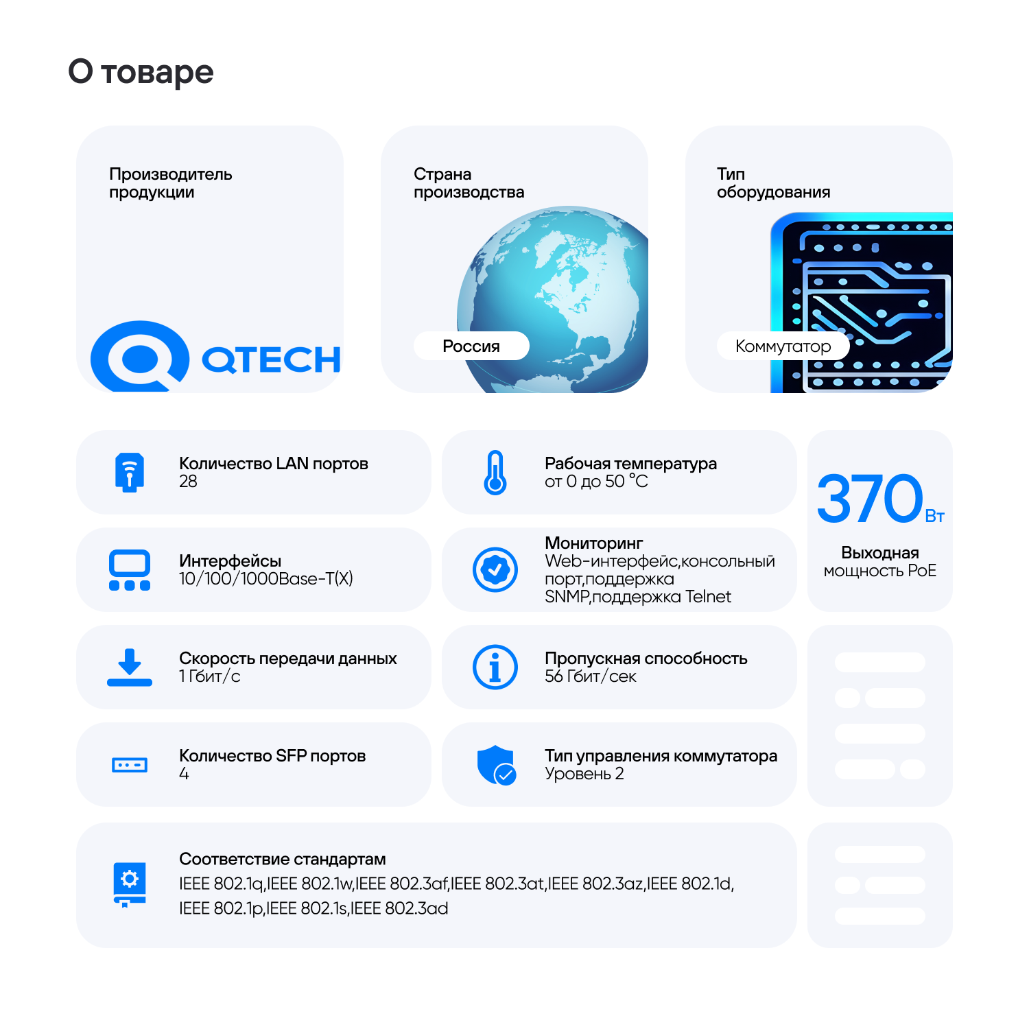 Коммутатор QTECH QSW-4610 QSW-4610-28T-POE-AC /PoE 370Вт./Управляемый Layer 2