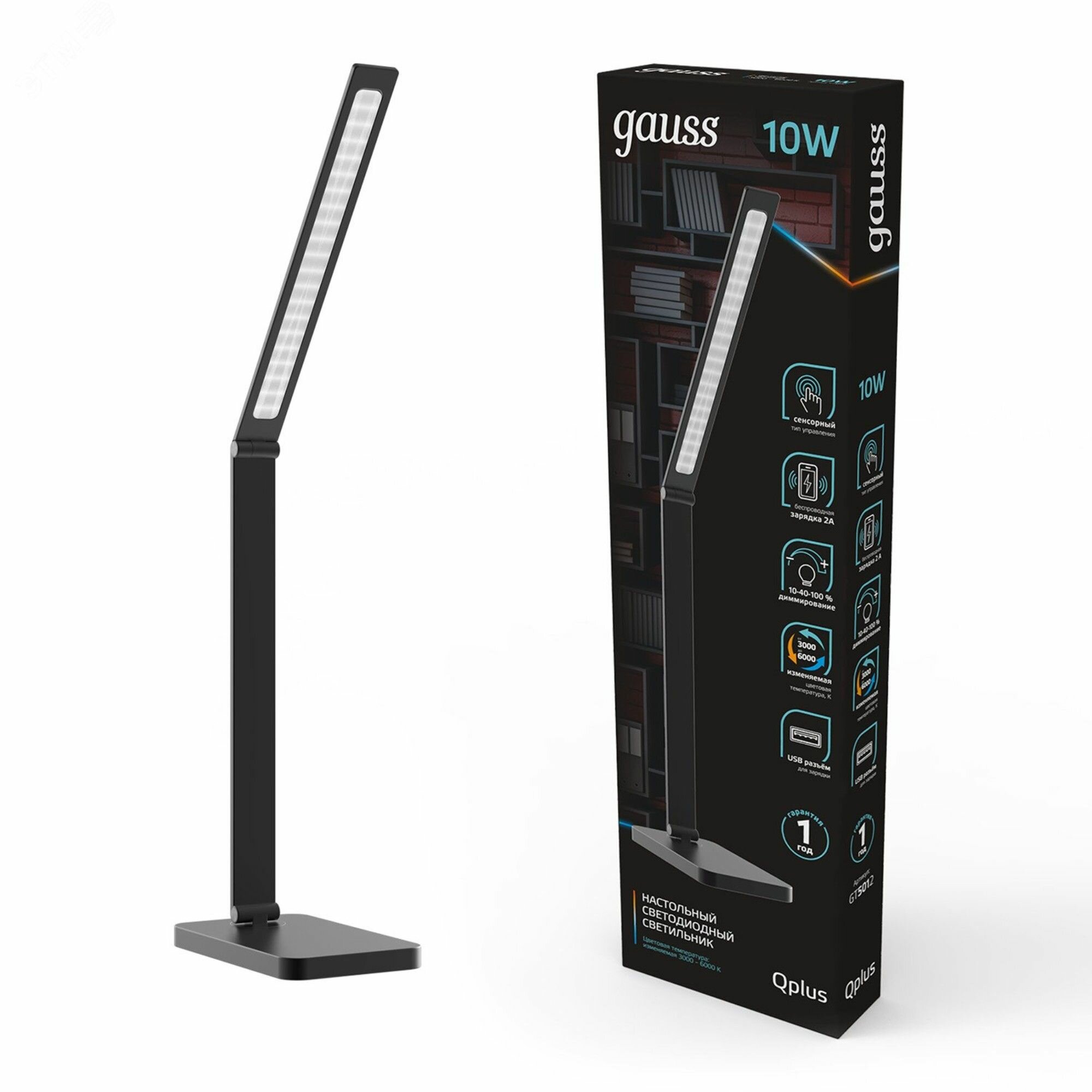 Gauss Светильник настольный Qplus GTL501 10W 600lm 3000-6000K 170-265V черный диммируемый Qi USB LED 1/12 GT5012 (5 шт.)