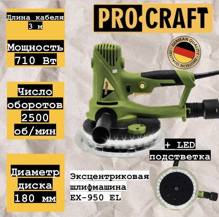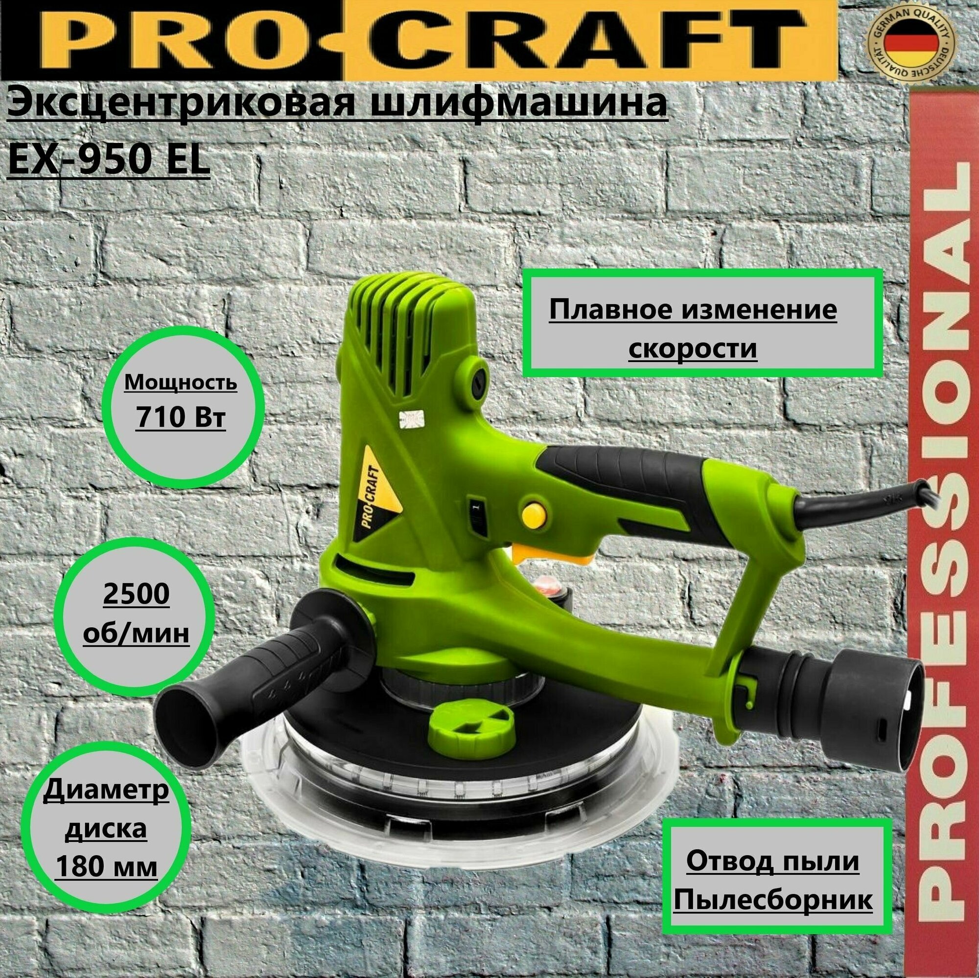 Эксцентриковая шлифмашина для стен Procraft EX950EL, 710Вт, 2500об/мин, 180мм, 6 наждачек
