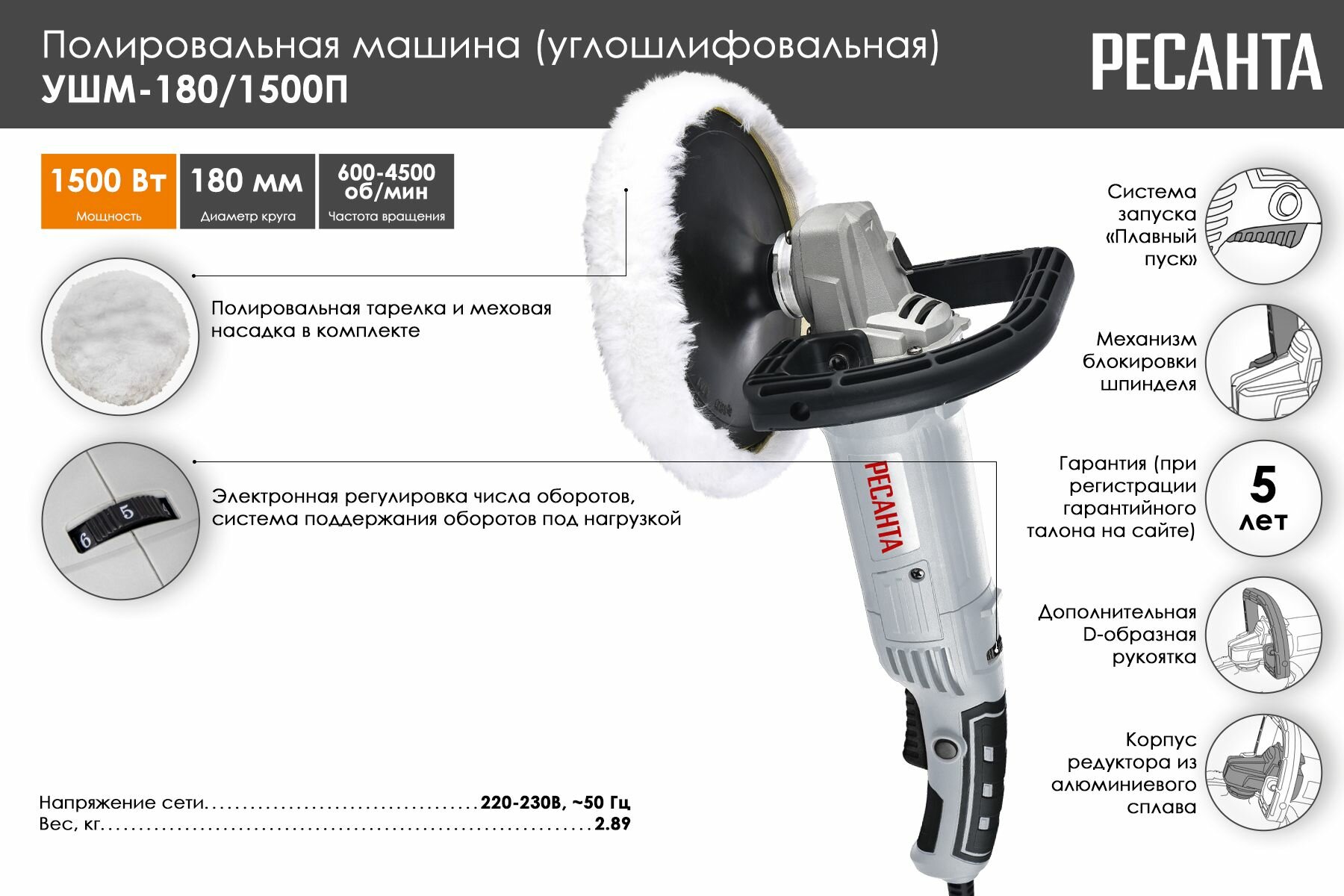 Купить Машина полировальная Ресанта, УШМ-180/1500П, 1500 Вт, 4500 об/мин