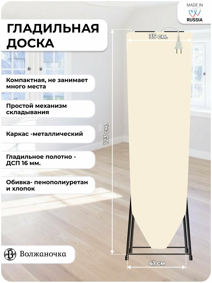 СохранитьВолжаночка Гладильная доска напольная с подставкой для утюга, розеткой и удлинителем, размер 115х35 см., цвет светло-бежевый интересное: