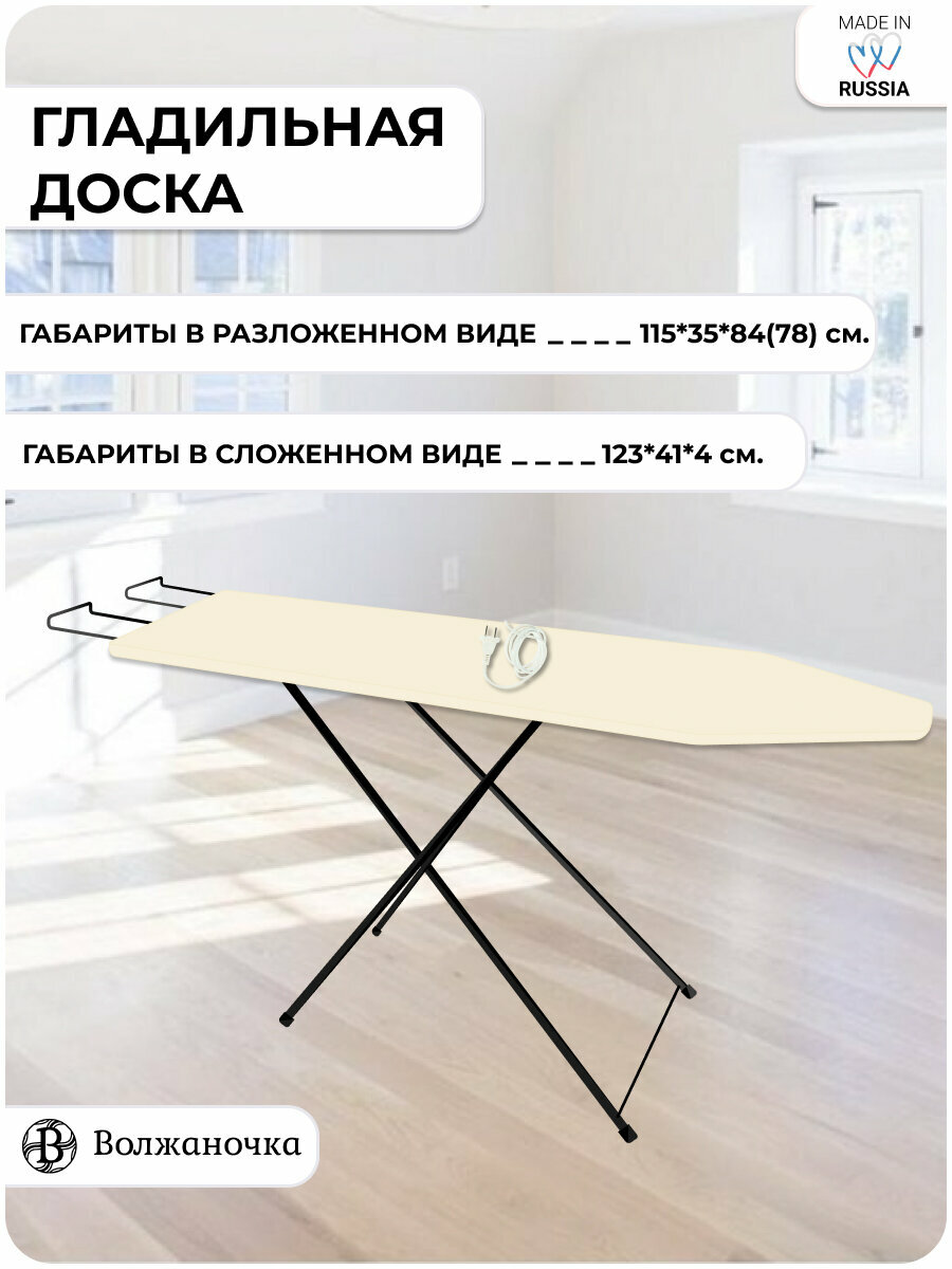 Доска гладильная Волжаночка , столешница 35 х 115 см, с подставкой под утюг, электроудлинителем с розеткой, цвет бежевый