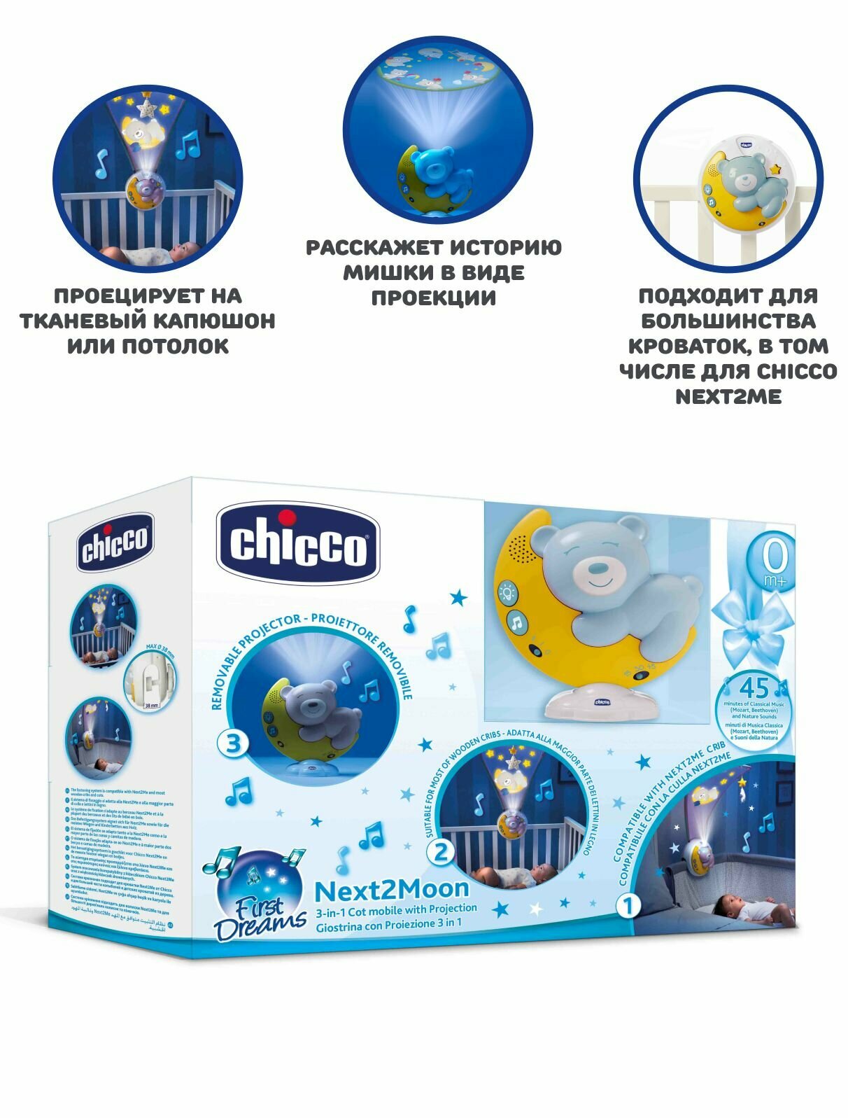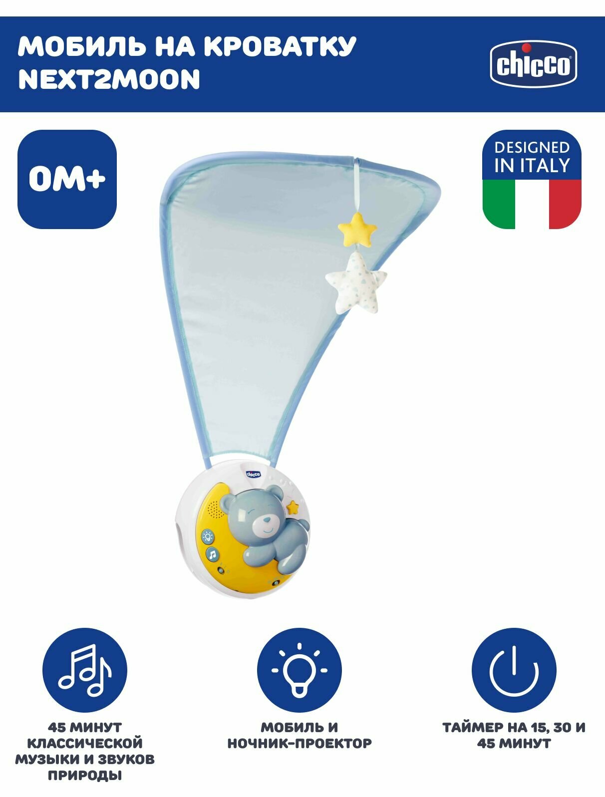 Купить Мобиль музыкальный в кроватку с детским ночником проектором Chicco Next2Moon голубой