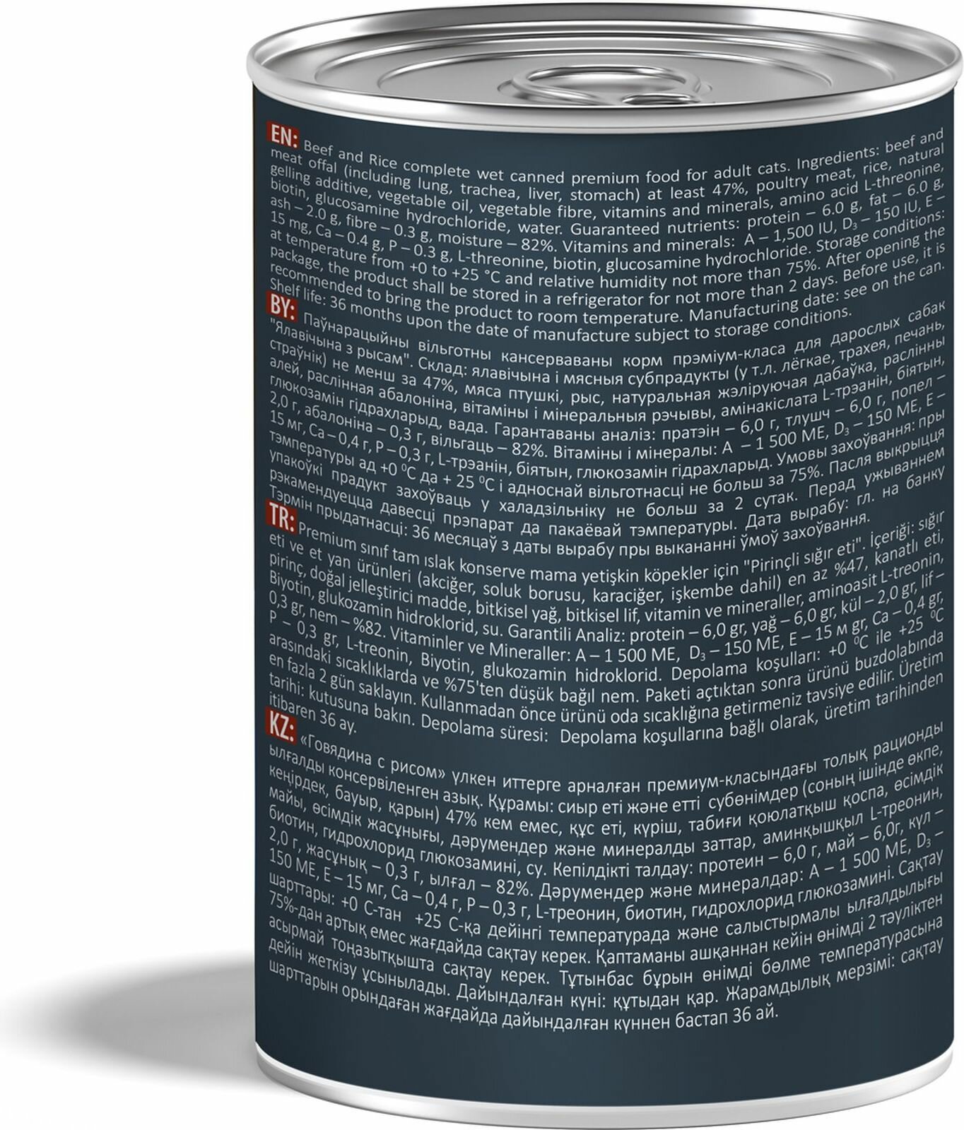 | Состав | Говядина и мясные субпродукты (в т.ч. легкое, трахея, печень, желудок) не менее 47%, мясо птицы, рис, натуральная желирующая добавка, растительное масло, растительная клетчатка, витамины и минеральные вещества, аминокислота L-треонин, биотин, глюкозамина гидрохлорид, вода. |