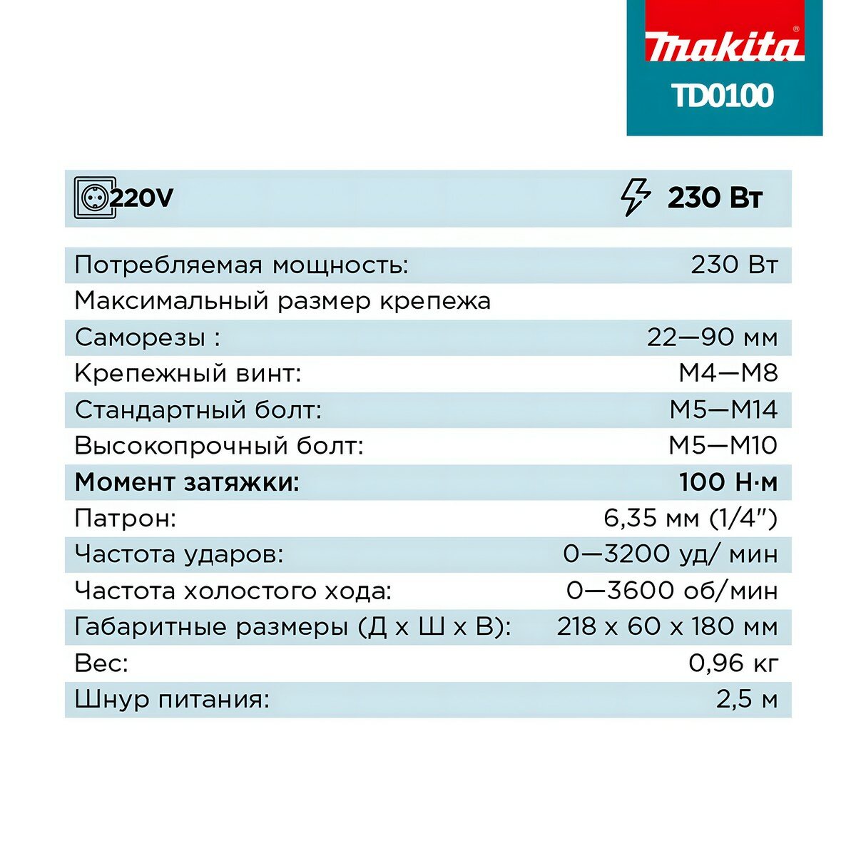 Ударный шуруповерт Makita TD0100, 230 Вт