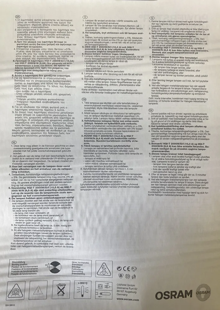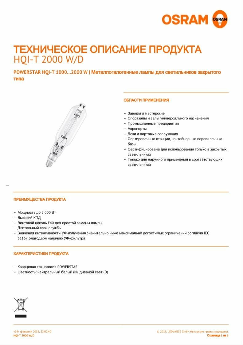 Ниже Вы можете прочитать отзывы на OSRAM HQI-T 2000/D/I - лампа металлогалогенная POWERSTAR® HQI®-T 2000W E40 дневной, ознакомится с подробными характеристиками, посмотреть интересные обзоры и фотографии на OSRAM HQI-T 2000/D/I - лампа металлогалогенная POWERSTAR® HQI®-T 2000W E40 дневной.