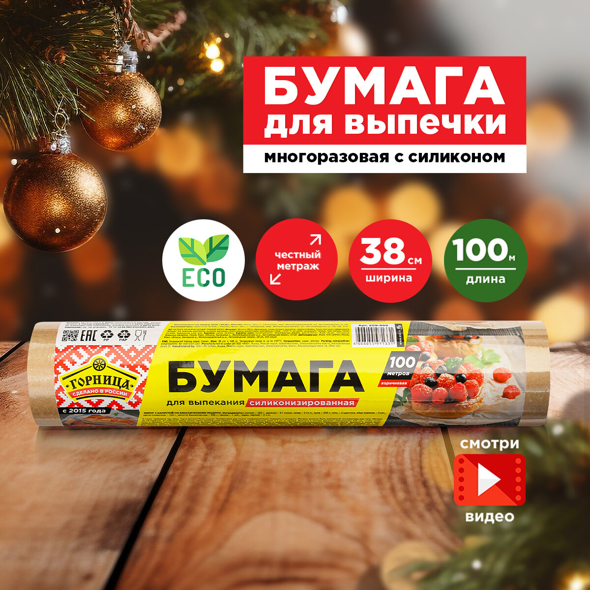 Пергамент для выпекания, силиконизированный натуральный, коричневый, Горница, 38см*25м (в пленке), широкая, евросырье, плотность - 41 г/кв.м, с двухсторонней силиконизацией, до + 280 °C