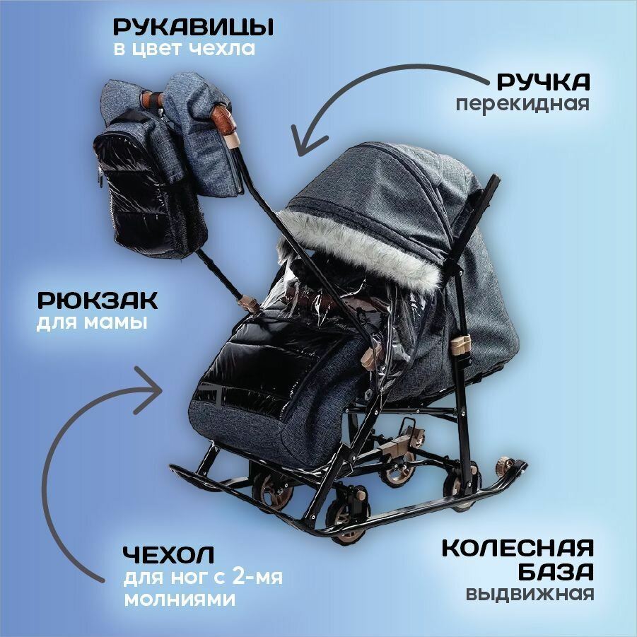 Санки-коляска Galaxy Glory Gloss Лён синий + светоотражающая ткань