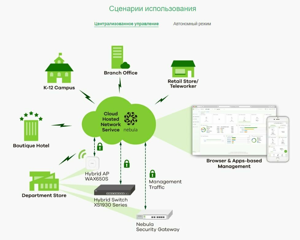| Мониторинг и конфигурирование | Web-интерфейс / облако Nebula / поддержка SNMP / поддержка Telnet |