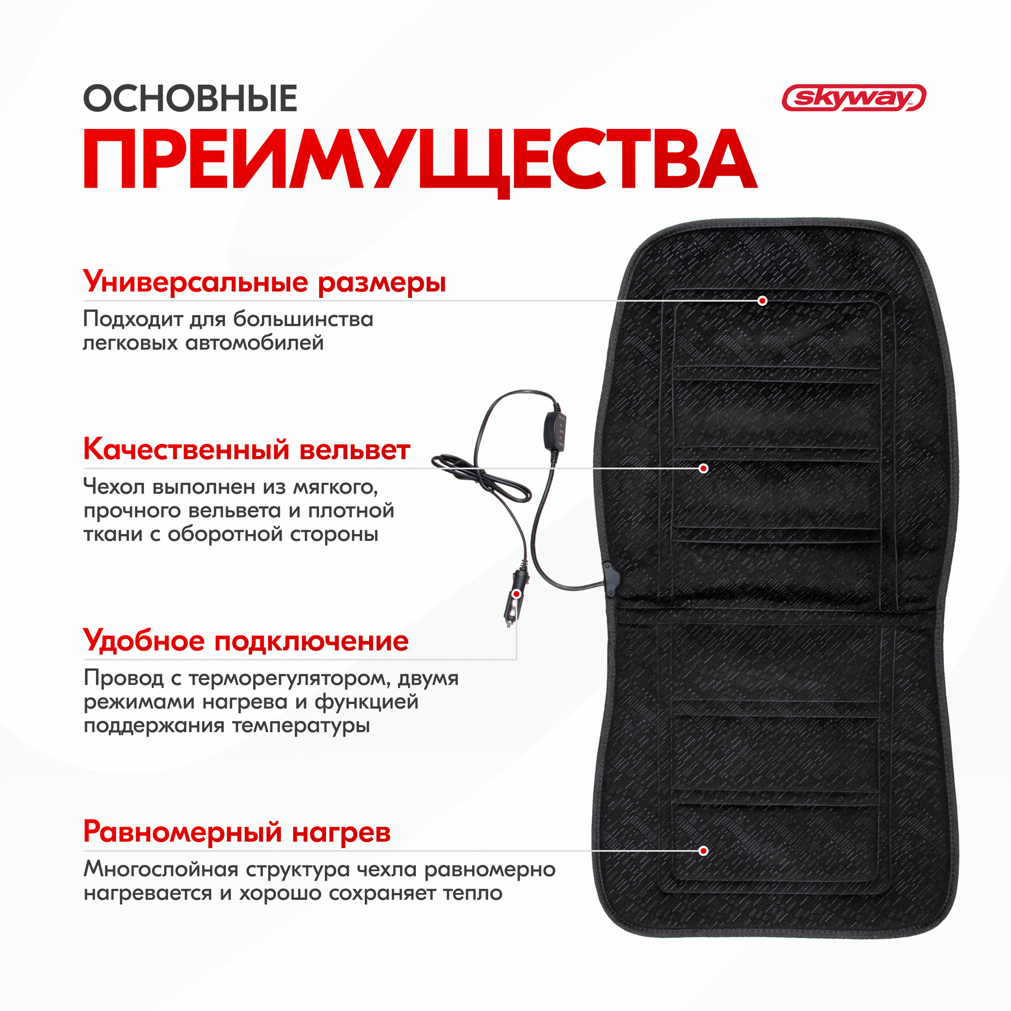 Подогрев сиденья со спинкой вельвет SKYWAY с терморегулятором (2 режима) Черный 12V 95х47см 2,5А-3, S02201018