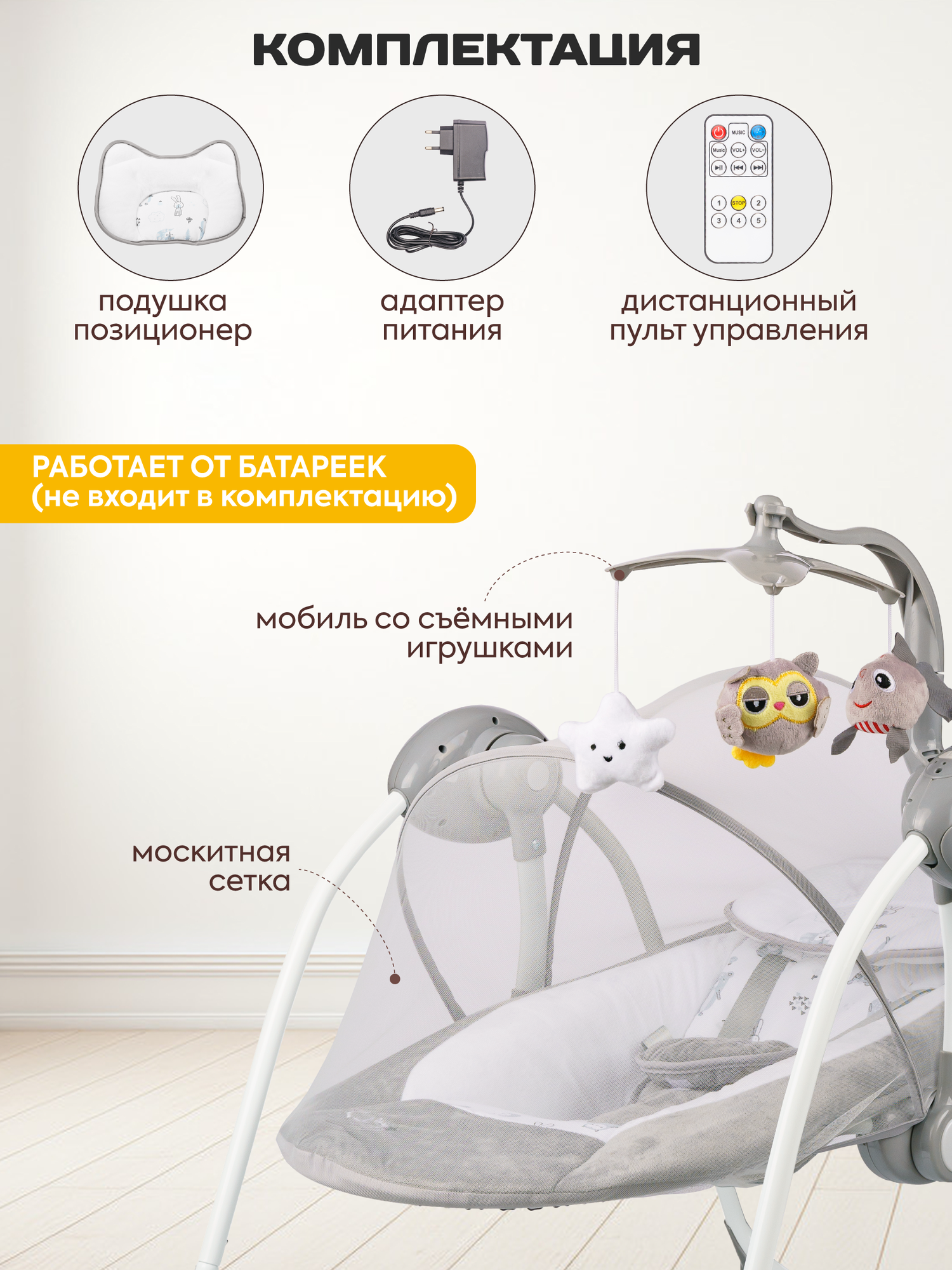| Особенности | пульт ДУ / работа от батареек / таймер музыки / таймер укачивания |