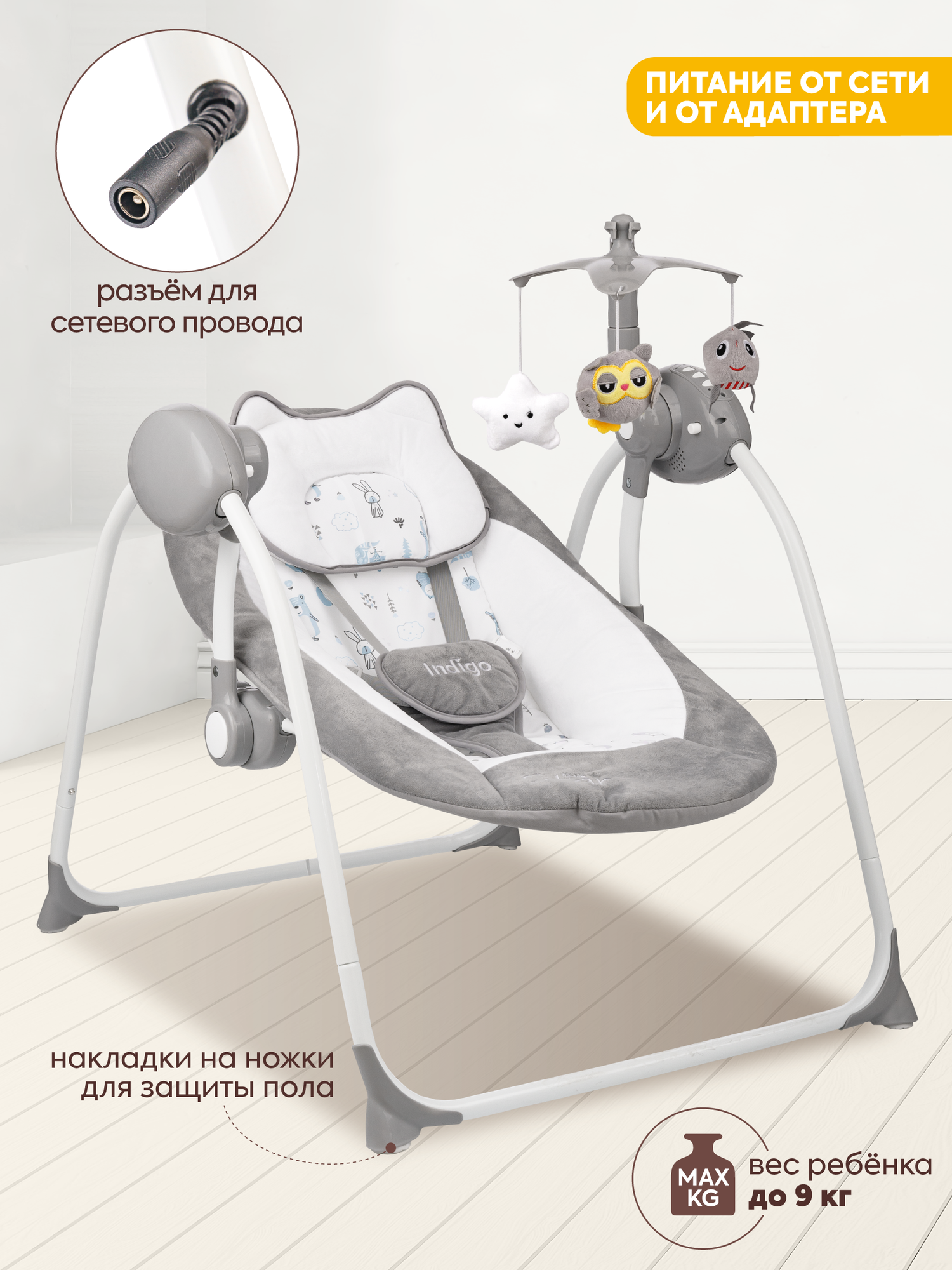 Электронные качели STAR (0-9 кг), с адаптером, пу, 12 мел., 5 скоростей, москитка (упак.1 шт.)(Indi