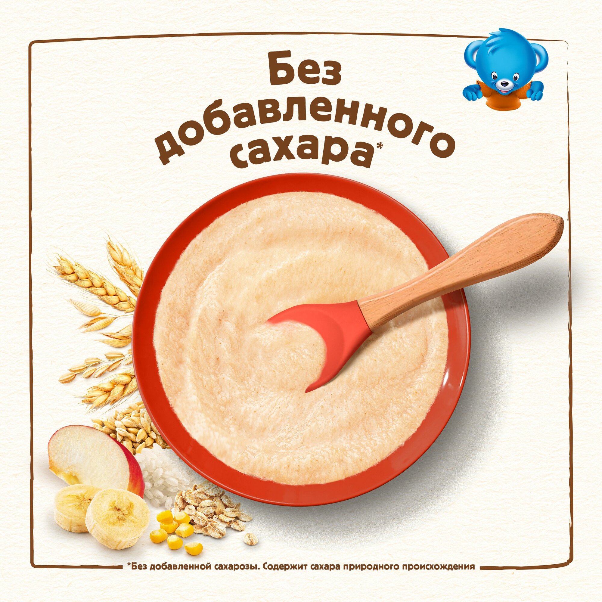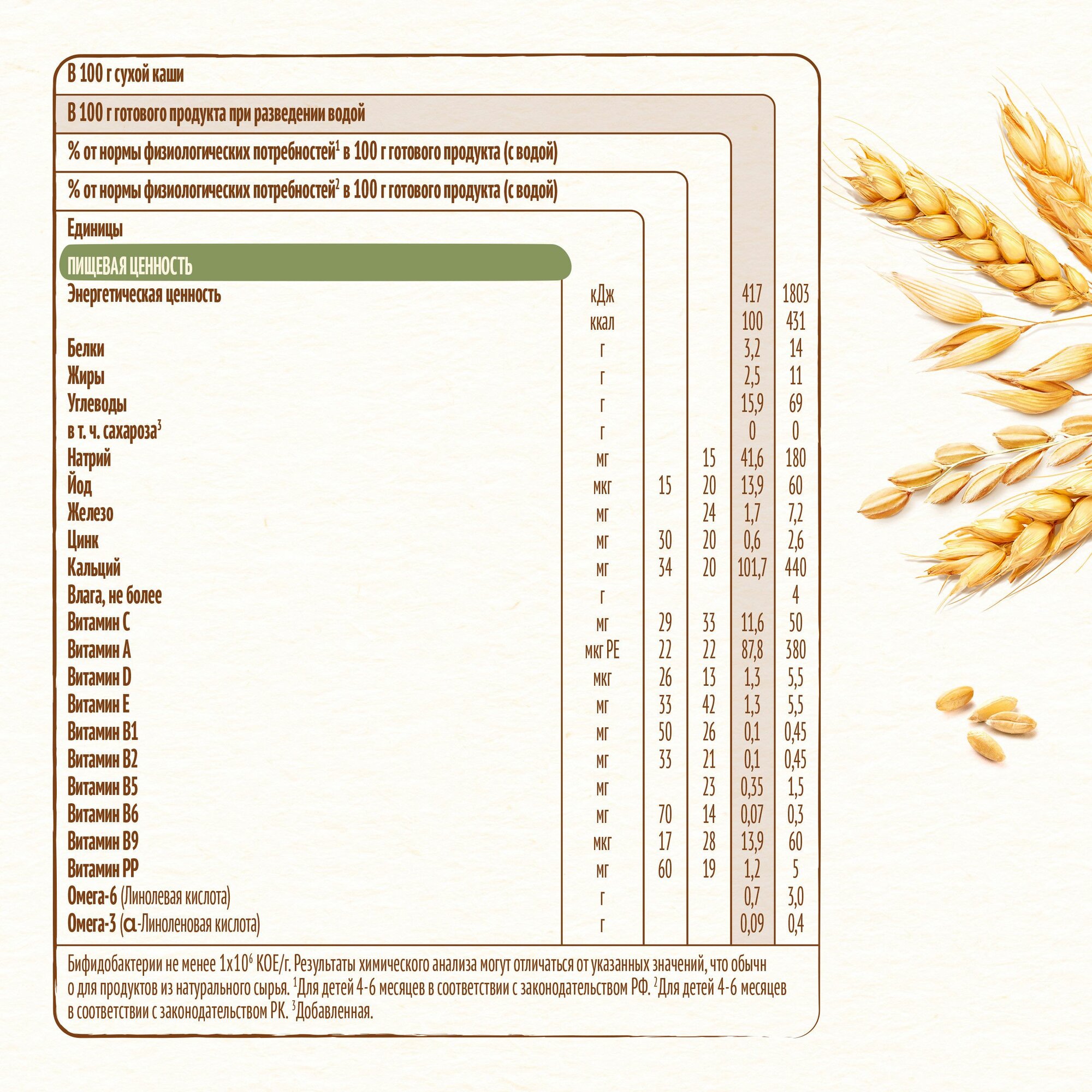 | Состав | мука (пшеничная (57%) (содержит глютен), овсяная (7,9%) (содержит глютен), рисовая (2%), кукурузная (2%)), молоко сухое обезжиренное (16,6%), смесь растительных масел (низкоэруковое рапсовое, подсолнечное высокоолеиновое, подсолнечное), антиокислители (L-аскорбилпальмитат, альфа-токоферол, лимонная кислота), хлопья банана (2,6%), хлопья яблока (1,5%), минеральные вещества (кальция карбонат, железа (II) фумарат, цинка сульфат, йодид калия), витамины (С (L-аскорбиновая кислота), E (DL-альфа-токоферола ацетат), РР (никотинамид), B5 (D-пантотенат кальция), A (ретинола ацетат), В1 (тиамина мононитрат), В6 (пиридоксин гидрохлорид), В2 (рибофлавин), B9 ( фолиевая кислота), D (D3 холекальциферол)), бифидобактерии не менее 1х10^6 КОЕ/г |