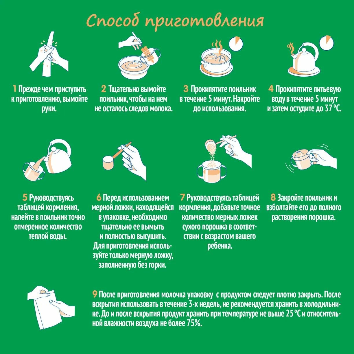 | Дополнительная информация | для сохранения живых бактерий вскипяченную воду следует остудить примерно до температуры тела (37 ̊С) и затем добавить сухой порошок. Для приготовления молочка необходимо использовать мерную ложку, заполненную без горки. Разведение неправильного количества порошка большего или меньшего по сравнению с количеством, указанным в таблице может привести к обезвоживанию организма ребенка или нарушению его питания. Указанные пропорции нельзя изменять без совета медицинского работника |